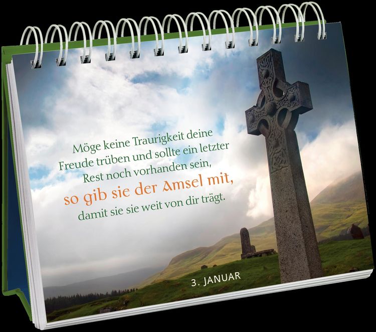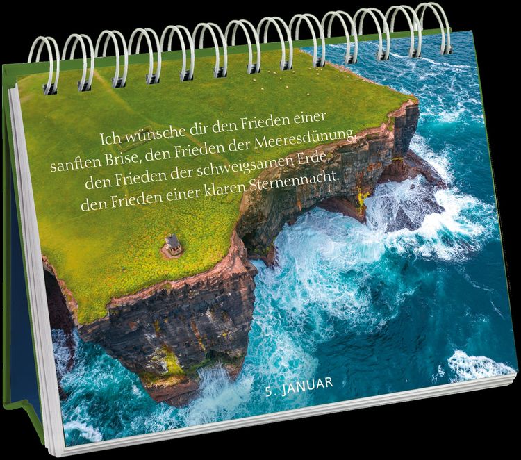 Wunderschöner Tischkalender mit irischen Segenswünschen für jeden Tag Tischkalender zum Aufstellen mit 365 irischen Segenswünschen Tolles Geschenk für Irland-Freunde und Fans der „Grünen Insel“ mit wunderschönen Fotos und emotional gestalteten Seiten Immerwährender Kalender mit Fotos von Irland und mit 384 Seiten (Maße: 15,7 x 13,2 cm) Der immerwährende (Jahres-)Kalender zum Aufstellen begeistert mit eindrucksvollen Irland-Fotos von weiten grünen Landschaften, mystischen Orten der Kelten, traditionsreicher Architektur und gemütlichen Pubs. Jedes der 365 Fotos für 365 Tage wird begleitet von einem poetischen irischen Segensspruch, der von Herzen kommt und berührt. Da der Tageskalender keine Jahreszuordnung enthält, können Sie sich jedes Jahr aufs Neue Tag für Tag auf eine inspirierende und beeindruckende Reise durch Irland begeben. Der Spiralaufsteller voller Weisheit, Stärke und Spiritualität ist auch ein wunderschönes Geschenk für alle Irland-Freunde und -Fans, ideal auch als Kleinigkeit zu Weihnachten, als Wichtelgeschenk – oder einfach so als Dankeschön für zwischendurch.
