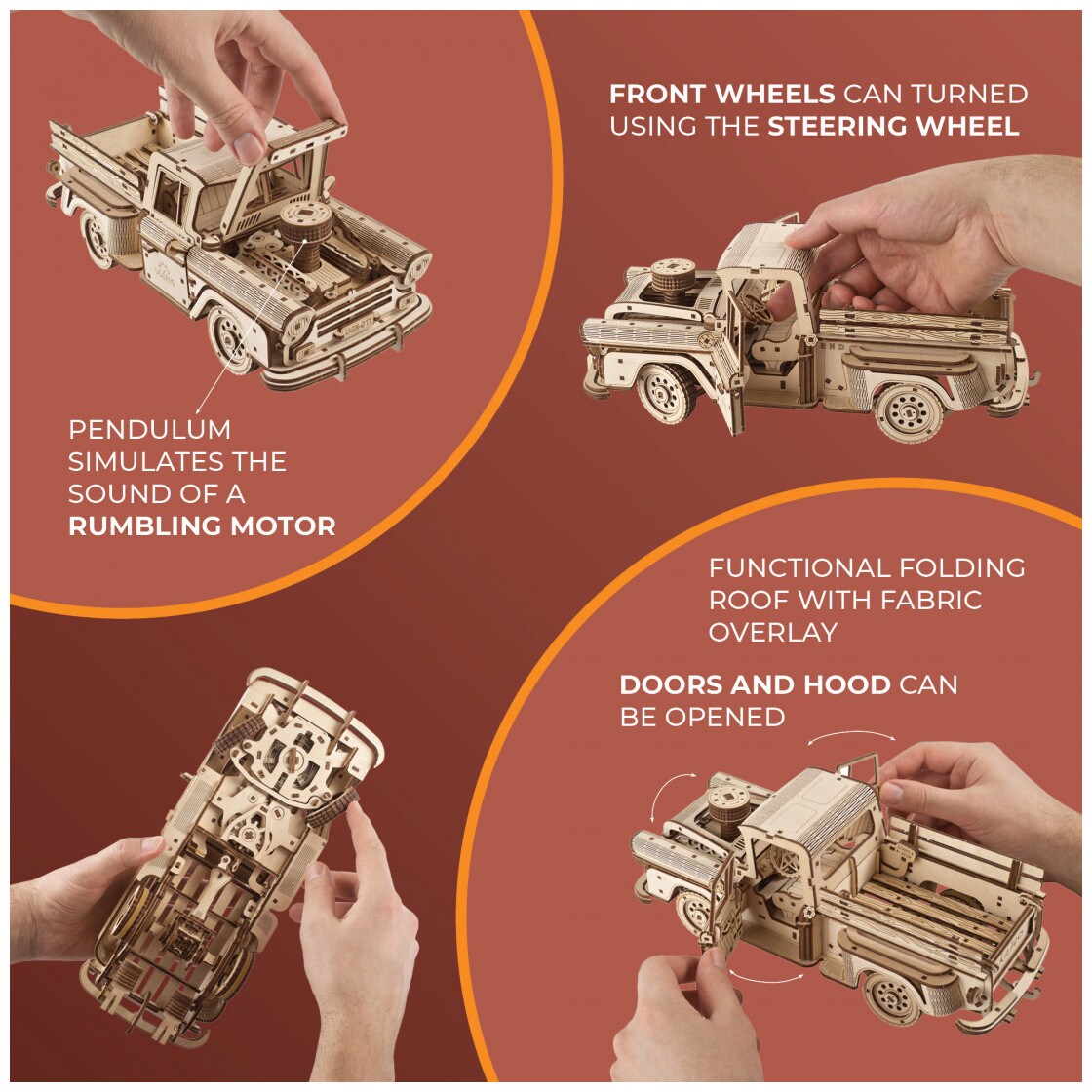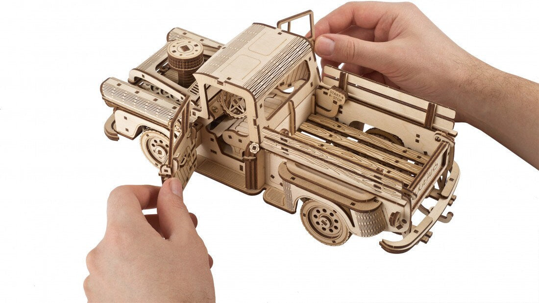 Der Pick-up Lumberjack hat 3 Modi: R (Rückwärtsgang), N (Leerlauf), D (Vorwärtsgang). Die Energie der Feder wird auf Zahnräder übertragen, um das Übersetzungsverhältnis zu erhöhen, und dann über das Getriebe auf die Antriebswelle, das Differential und die Hinterachse. Mit einem Start/Stopp-Mechanismus in der Ladefläche können Sie den Truck auf Kommando starten. Da wir uns bei Ugears auf die kleinen, skurrilen Details konzentrieren, die ein Modell außergewöhnlich machen, simuliert ein kleines Pendel unter den Sitzen das Schütteln vom starken Motor. Gebogenes Sperrholz verleiht dem Modell schöne Linien und einen Stil der 1950er Jahre. Die Türen des Pickups lassen sich von innen und außen öffnen und die Heckklappe lässt sich herunterklappen. Die Vorderräder lassen sich mit dem Lenkrad drehen und für elegante Kurvenfahrten festmachen. Der Pick-up Lumberjack hat außerdem vorne und hinten eine Federung, damit Sie auf den Landstraßen nicht zu sehr durchgeschüttelt werden.