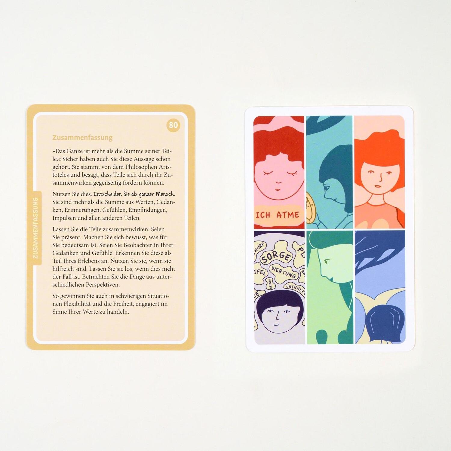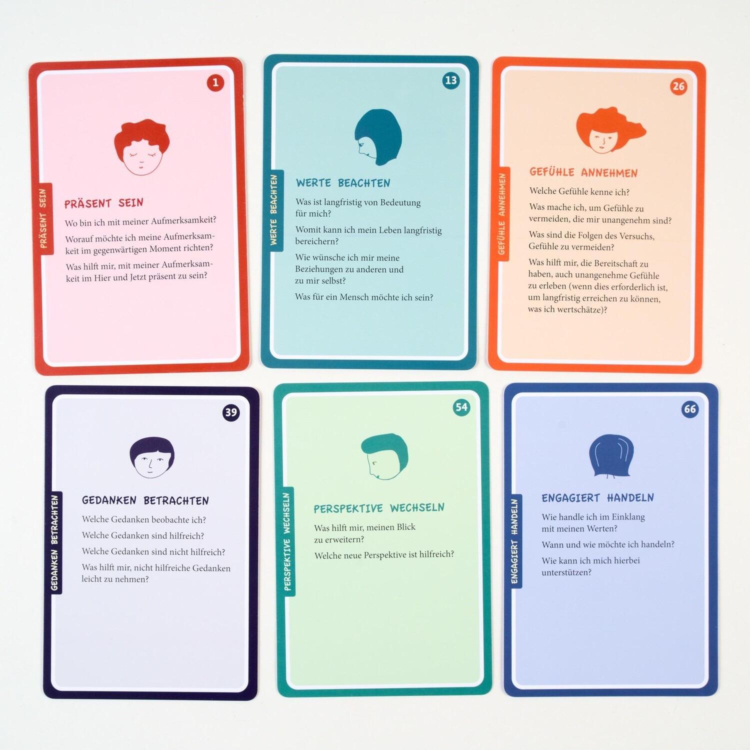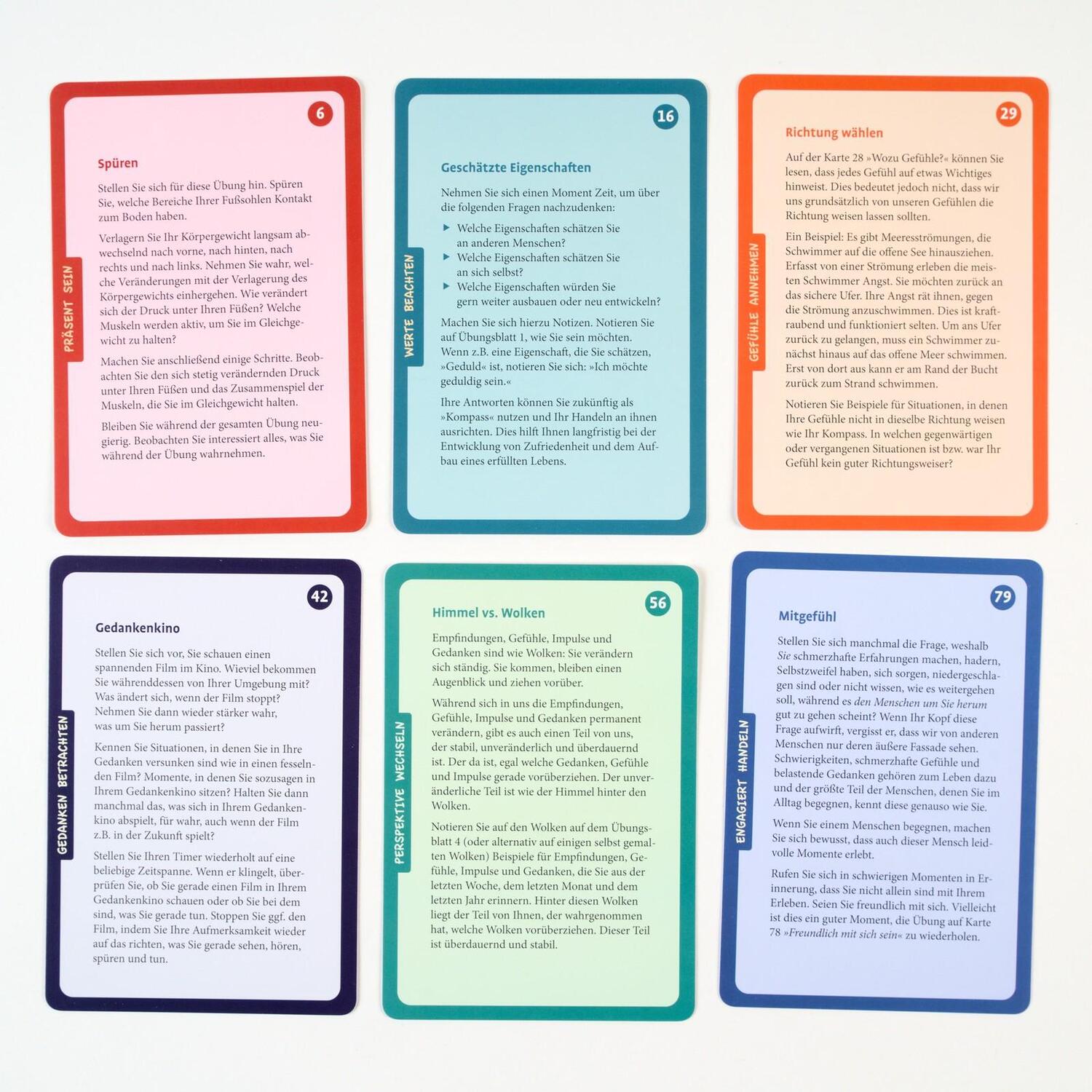 Schwierige Lebenssituationen, belastende Gedanken und Gefühle - mit Übungen aus der Akzeptanz- und Commitmenttherapie (ACT) kann man lernen, sie gut zu bewältigen. Selbst Symptome psychischer Erkrankungen lassen sich damit lindern. Anhand der Karten können die sechs Kernprozesse der Akzeptanz- und Commitmenttherapie trainiert werden: (1) Präsent sein, (2) Werte beachten, (3) Gefühle annehmen, (4) Gedanken betrachten, (5) Perspektive wechseln, (6) Handeln