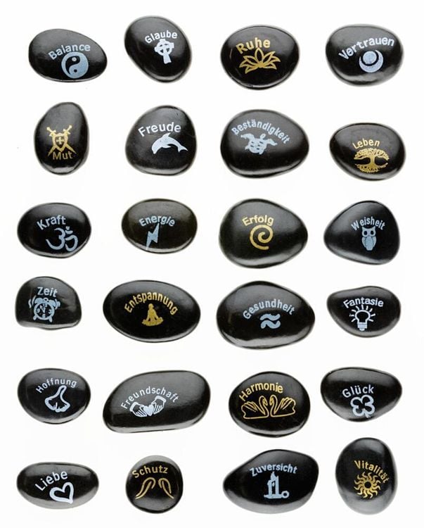24 gute Wünsche zu entdecken Natursteine: mit Wunsch & Symbol Als Deko, Mitbringsel, Handschmeichler ... Adventskalender zum Verschenken oder Selbstbehalten Gute Wünsche, zum Greifen nahe: Adventskalender Glückssteine Hinter jedem Türchen finden Sie einen Stein, der Ihnen den Wunsch des Tages zum Motto macht: Glück, Kraft, Weisheit, Vitalität u.v.m. So erleben Sie jeden Tag in der Adventszeit einen besinnlichen Moment. Genießen Sie ihn und machen Sie ihn zu einem besonderen Ritual im Dezember. Wiegen Sie die Natursteine beruhigend in der Hand oder nutzen Sie sie als ansprechende Dekoration! Tipp: Der Adventskalender ist auch eine wunderschöne Geschenk-Idee für Menschen, die Ihnen am Herzen liegen. Die Steine und die damit verbundenen guten Wünsche sind eine bleibende Erinnerung. Adventskalender Glückssteine mit 24 anthrazitfarbenen Natursteinen jeder Stein bedruckt mit einem anderen Wunschbegriff und dazu passendem Symbol koloriert in Weiß, Grau und Gold perfekt als Dekosteine, Handschmeichler, Erinnerungsstütze auf dem Schreibtisch etc. Steine Ø je ca. 3,5 cm; jedes Stück ein Unikat Der Adventskalender "Glückssteine" ist ein Füllhorn an guten Wünschen, die Sie die gesamte Vorweihnachtszeit hindurch begleiten. Entdecken Sie Tag für Tag einen neuen Stein, einen anderen Wunsch und ein anderes Symbol ... Lassen Sie sich überraschen! Ob für Sie selbst oder zum Verschenken: Jetzt gleich bestellen bei uns im Online-Shop!