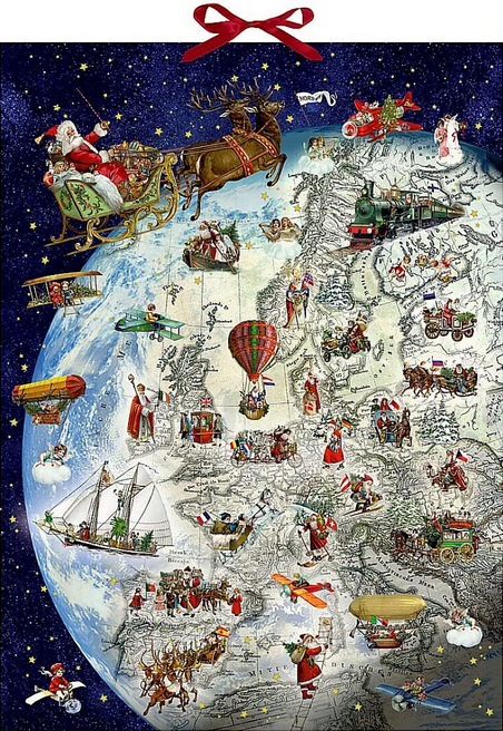 Großer Adventskalender mit Glitter und Schleifenband. Der Weihnachtsmann ist unterwegs um Geschenke für Groß und Klein zu verteilen. Auf seiner Reise trifft er auf die unterschiedlichen Bräuche und Traditionen aus vielen Ländern. Hinter jedem Türchen gibt es spannende Motive und Informationen zu den unterschiedlichsten Weihnachtsfiguren und -bräuchen ganz unterschiedlicher Länder zu entdecken.