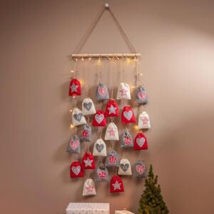 Geniessen Sie jedes Jahr einen originellen Adventskalender in Form von 24 nummerierten Filztäschchen, in denen Sie Ihren Kindern alles Mögliche verstecken können. Der Kalender ist zusätzlich mit einer Lichterkette mit 20 LEDs verziert, damit er auch im Dunkeln schön zur Geltung kommt. Inklusive Holzstange und Juteschnur.