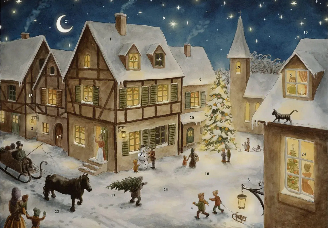 Ein wunderschön nostalgisch gestalteter Adventskalender, der so richtig Weihnachtsgefühle aufkommen lässt. So stellt man sich den Heiligen Abend in einem verschneiten Dorf vor. Kinder bereiten sich auf die Bescherung und den Kirchgang vor. Hell erleuchtete Fenster, rauchende Kaminfeuer. Auf diesem Adventskalender ist wirklich viel zu entdecken und jedes geöffnete Türchen ergänzt das Geschehen auf nette Art und Weise. So war Weihnachten früher! Grösse des Adventskalenders ca. 26,5 x 35,5 cm