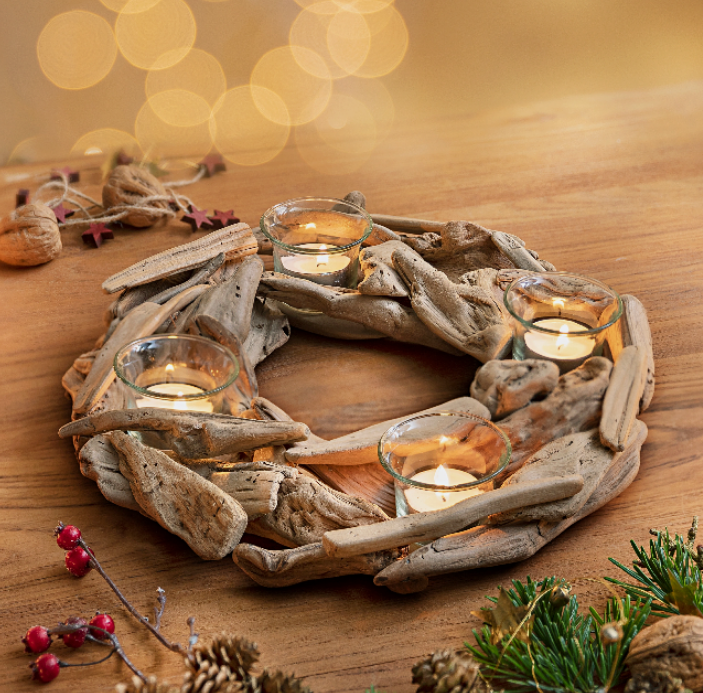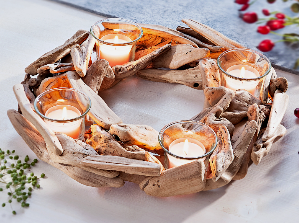 Jeden Sonntag wird eine weitere Kerze angezündet – so werden die vier Wochen bis zum Weihnachtsfest immer heller und stimmungsvoller. Der Adventkranz aus Treibholz interpretiert diesen klassischen Brauch ganz zeitgemäß.