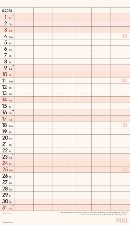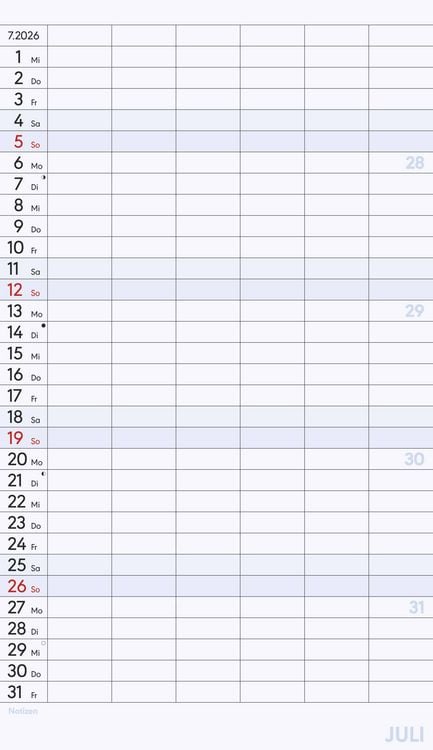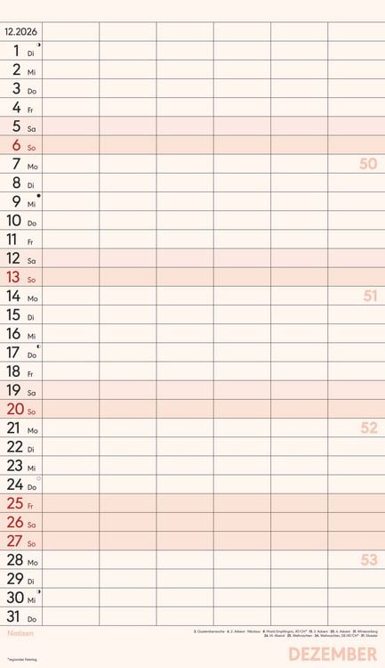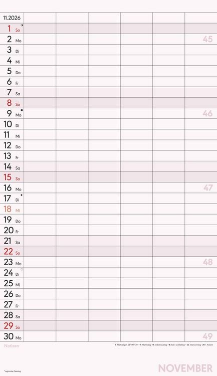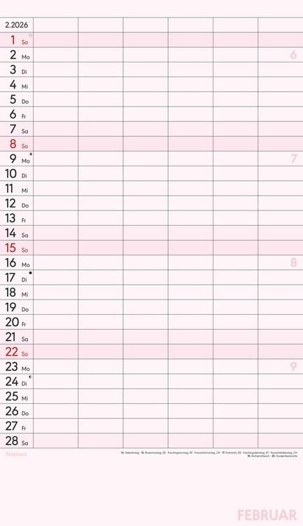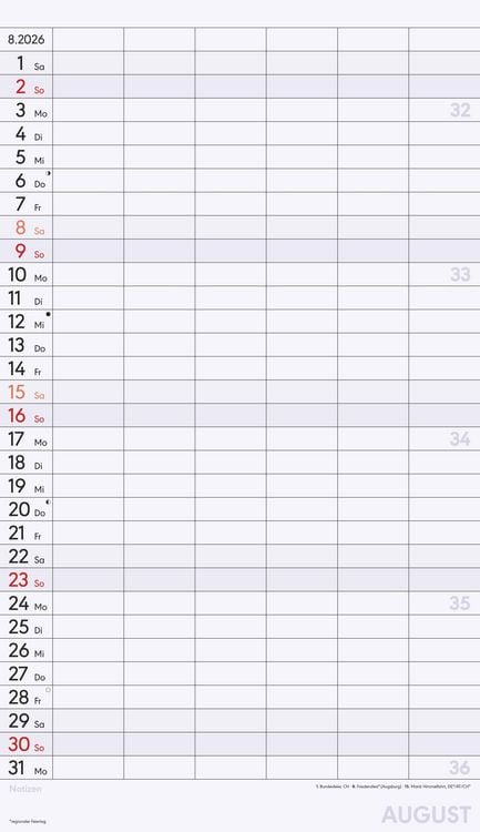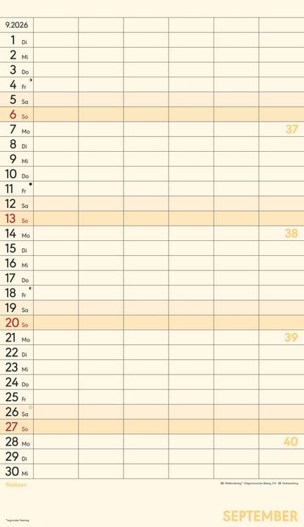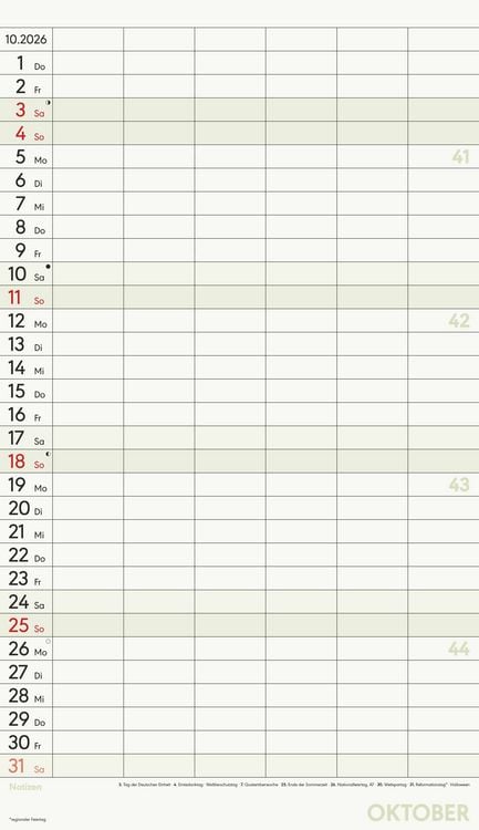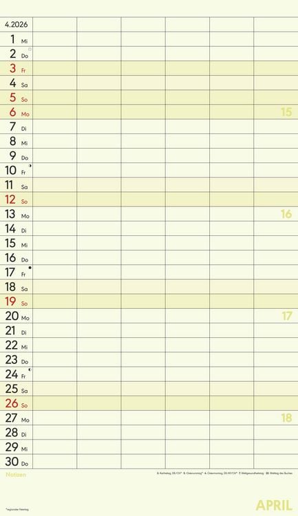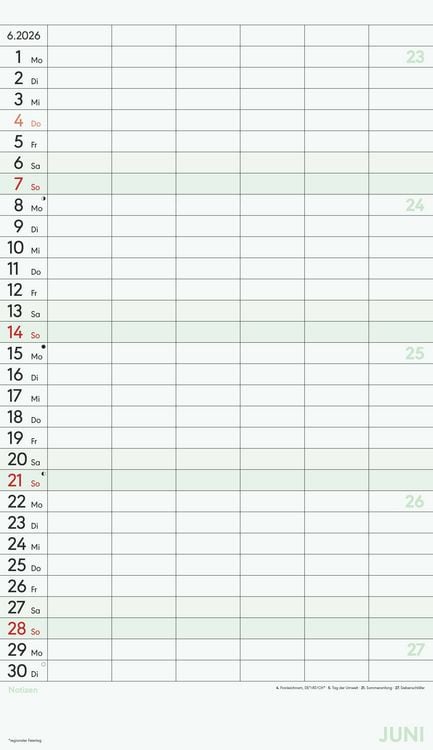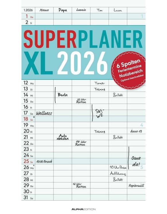 Gedruckt auf hochwertigem Offset-Papier für eine ideale Beschreibbarkeit der Kalenderseiten Hergestellt in Deutschland Deutschsprachiges Kalendarium Feiertage (DE/AT/CH/FR/IT) 6 Spalten für übersichtliches Eintragen von Terminen Zusätzlicher Notizbereich unter dem Kalendarium Mit Ringbindung Maße: 26 x 45 cm Sie finden bei uns eine große Auswahl an Familienplanern in verschiedenen Formaten und mit den unterschiedlichsten Motiven - da ist auch für Sie der passende dabei! Ob der gemeinsame Shopping-Tag, der nächste Spieleabend oder der Schulausflug der Kinder - dank des Familienplaners XL und seinen sechs übersichtlichen Spalten haben Sie alle Termine Ihrer Familie stets im Blick. Dieser Planer begleitet Sie durch das Jahr mit zwölf Kalenderseiten aus hochwertigem und leicht beschreibbarem Offset-Papier, wodurch das Eintragen von Terminen und Notizen 2026 besonders komfortabel ist. Das bunte und moderne Design macht das Eintragen und Planen jeden Monat zu einem echten Vergnügen - und Sie vergessen nie wieder einen wichtigen Termin. Der Familienplaner XL mit 6 Spalten der Marke Alpha Edition ist eine sehr nützliche Hilfe im Alltag, ein echter Blickfänger, der jeden Raum schmückt und dank der vielen Spalten perfekt für die große Familie. Das Team der Neumann Verlage wünscht Ihnen viel Freude mit unseren Familienkalendern!