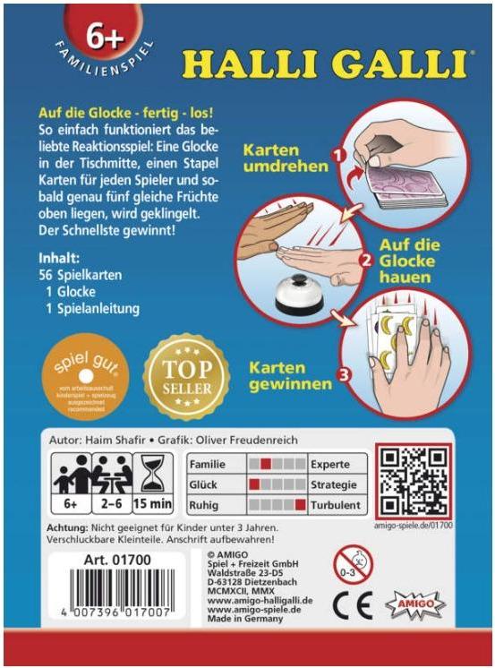 Reihum deckt jeder Spieler eine Karte auf. Sobald auf allen offenen Karten zusammen genau fünf Früchte einer Sorte liegen, gewinnt der Spieler, der zuerst klingelt, alle offen liegenden Ablagestapel. Wer am Ende die meisten Karten erklingelt hat, ist Sieger. Ein grosser Obstsalat mit Bananen, Erdbeeren, Limonen und Pflaumen. Halli Galli ist einfach grosser Spielspass für die ganze Familie, setzt auf Reaktionsvermögen und Geschwindigkeit und schult nebenbei noch ein schnelles Auge. Für 2 bis 6 Spieler ab 6 Jahren. Spieldauer ca. 15 Minuten.