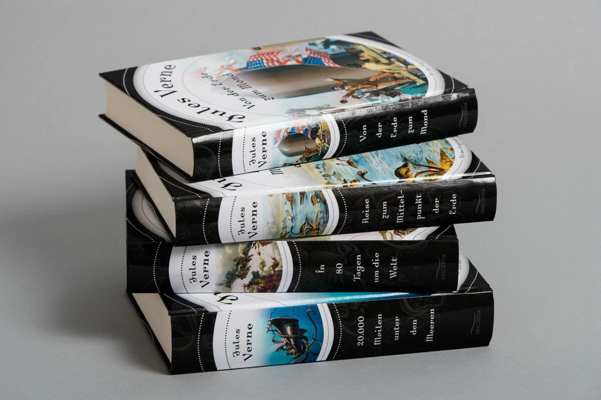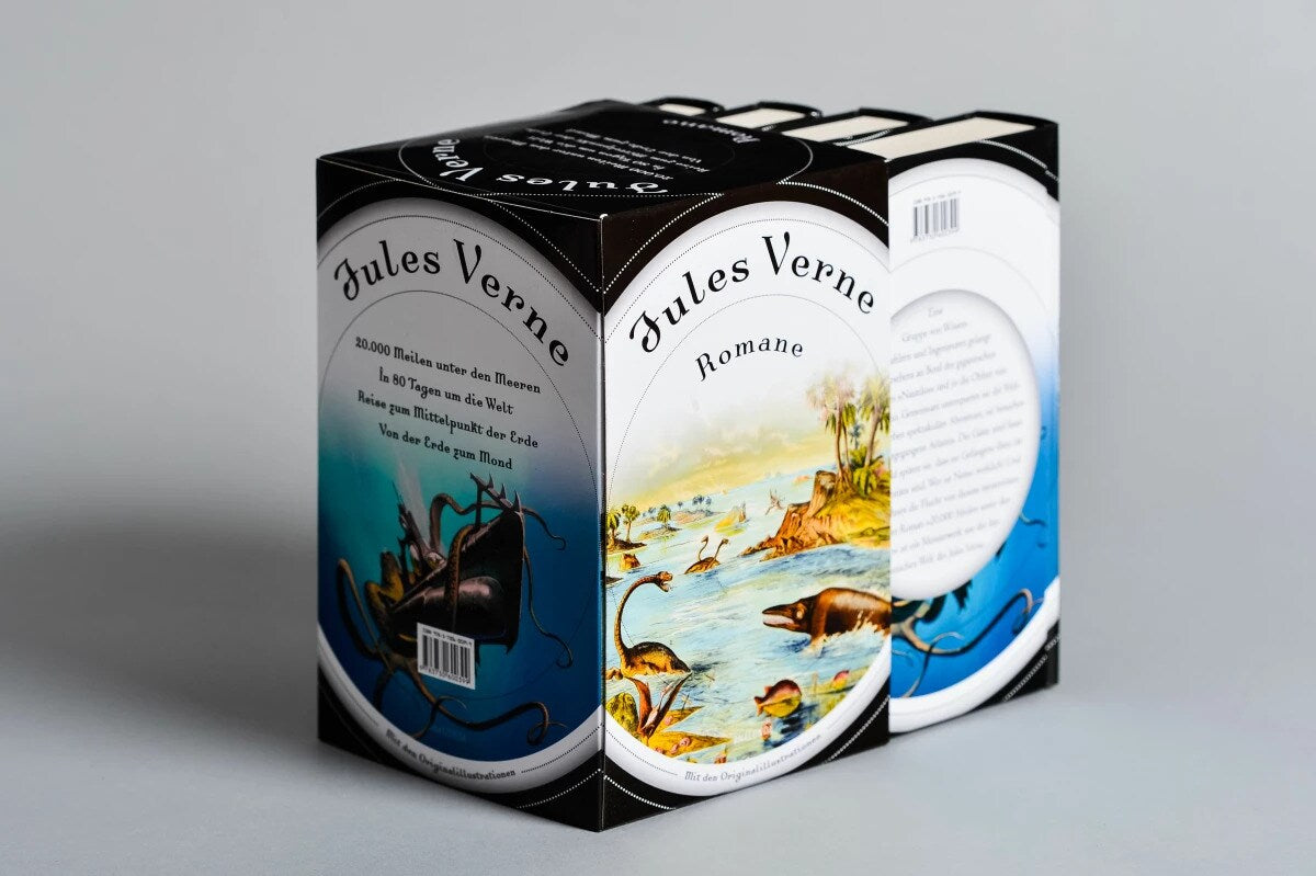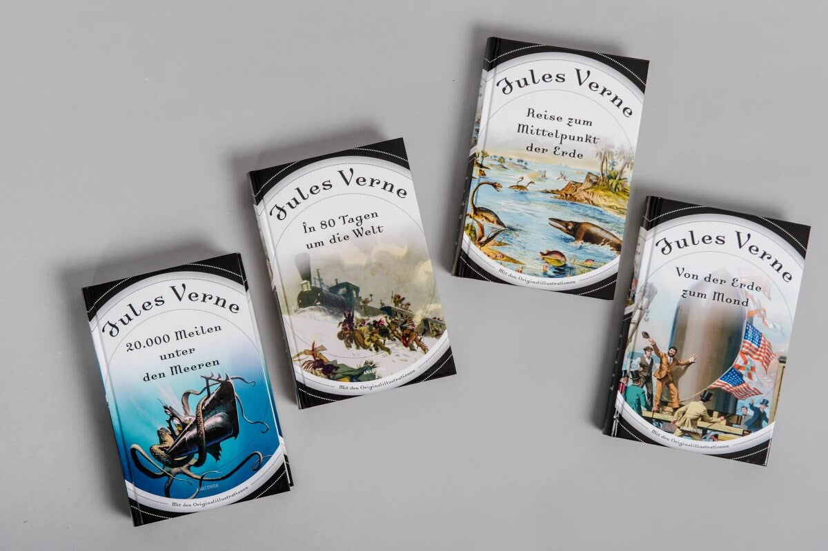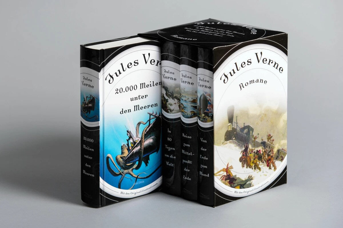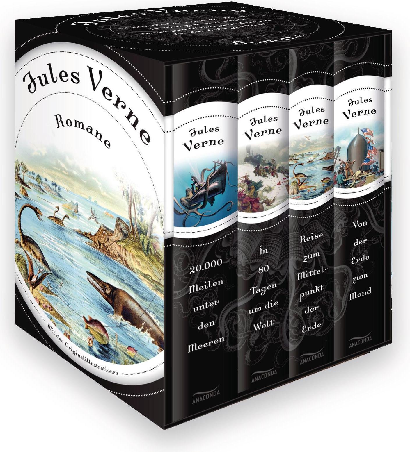 Dank seiner überreichen Fantasie führt Jules Verne seine Helden und Leser an jeden nur denkbaren Ort der Welt: tief in die Erde und ihre Ozeane hinein, hoch in die Lüfte und sogar in den Weltraum. Und noch immer sind seine Erfindungen oft fesselnder als die spannendsten Fakten der heutigen Wissenschaft. Die vier Bände versammeln einige der besten Romane Jules Vernes für junge Leser auf Entdeckungsfahrt: '20.000 Meilen unter den Meeren', 'In 80 Tagen um die Welt', 'Reise zum Mittelpunkt der Erde' und 'Von der Erde zum Mond'.