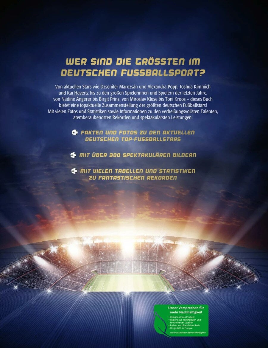 Eine topaktuelle Zusammenstellung der größten deutschen Fußballstars für alle Fußballfans!Diese Sammlung der herausragendsten Fußballerinnen und Fußballer aus Deutschland fasziniert alle fußballbegeisterten Kinder ab 8 Jahren - und die Erwachsenen dazu! Im Fußballjahr 2022 mit der Fußball-WM in Katar bietet dieses Sachbuch einen aktuellen und vielschichtigen Überblick über die deutschen Stars - von den größten deutschen Sportlern bis zu besonderen Talenten, außergewöhnlichen Rekorden und spektakulären Leistungen.Spannende Fakten: Wissenswertes rund um Spitzenspieler und -spielerinnen der letzten Jahrzehnte, Rekorde, Statistiken und Sensationen aus DeutschlandToll bebildert: Jede Seite zeigt die Stars auf hochwertigen Fotos und lädt zum Blättern und Stöbern einTopaktuell: Eine Samnmlung, die sich kein kleiner oder großer Fußballfan entgehen lassen kann - ein Fußballerlebnis für die ganze FamilieDas perfekte Geschenk: Mit diesem Kindersachbuch macht man allen Fußballbegeisterten ab 8 Jahren eine FreudeWer sind die Größten im deutschen Fußballsport?Von aktuellen Stars wie Serge Gnabry, Joshua Kimmich und Marco Reus bis zu den großen Spielerinnen und Spielern der letzten Jahre wie Nadine Angerer, Birgit Prinz oder Bastian Schweinsteiger, Miroslav Klose und Oliver Kahn.