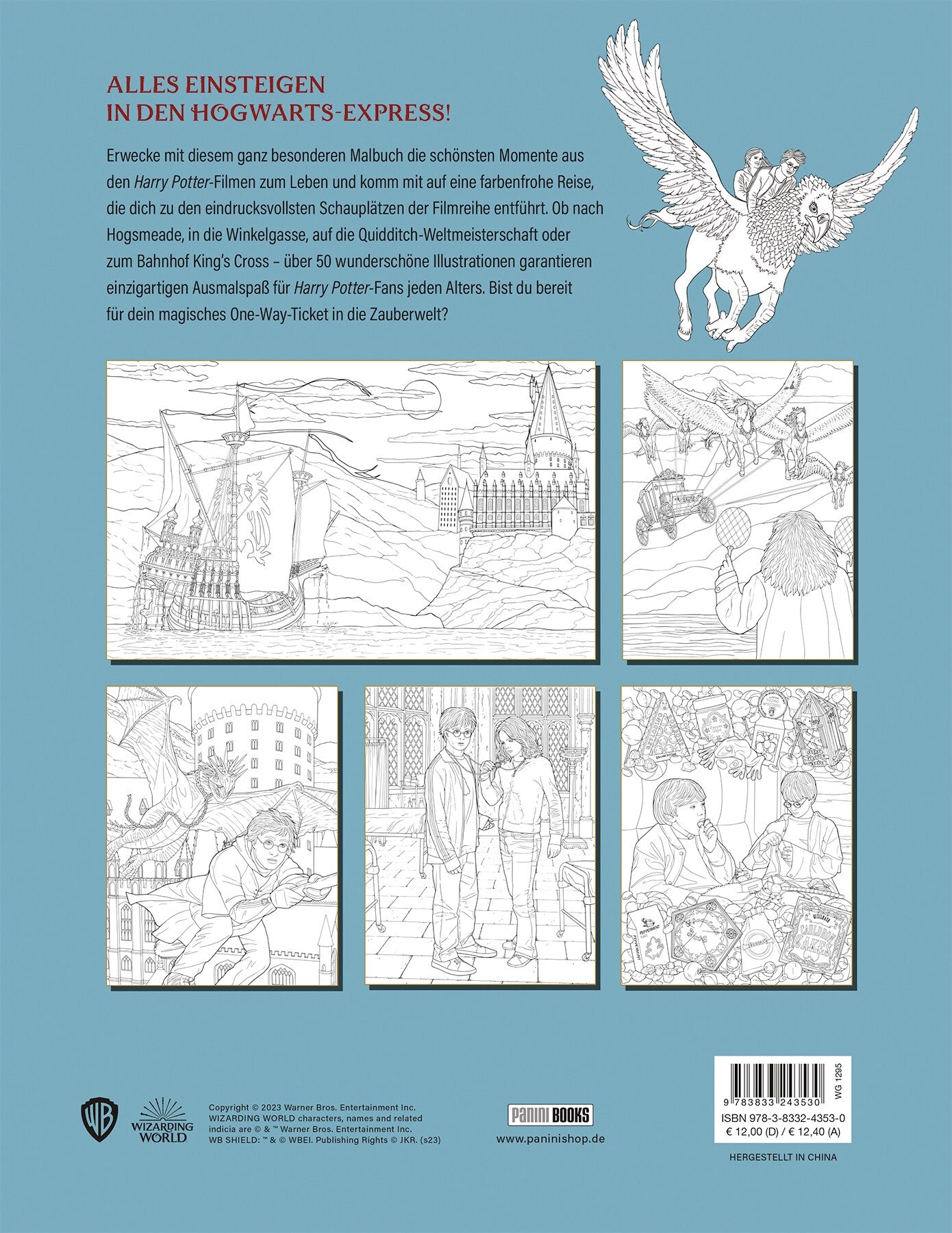 ALLES EINSTEIGEN IN DEN HOGWARTS-EXPRESS!Erwecke mit diesem ganz besonderen Malbuch die schönsten Momente aus den Harry Potter-Filmen zum Leben und komm mit auf eine farbenfrohe Reise, die dich zu den eindrucksvollsten Schauplätzen der Filmreihe entführt. Ob nach Hogsmeade, in die Winkelgasse, auf die Quidditch-Weltmeisterschaft oder zum Bahnhof King's Cross - über 50 wunderschöne Illustrationen garantieren einzigartigen Ausmalspass für Harry Potter-Fans jeden Alters. Bist du bereit für dein magisches One-Way-Ticket in die Zauberwelt?