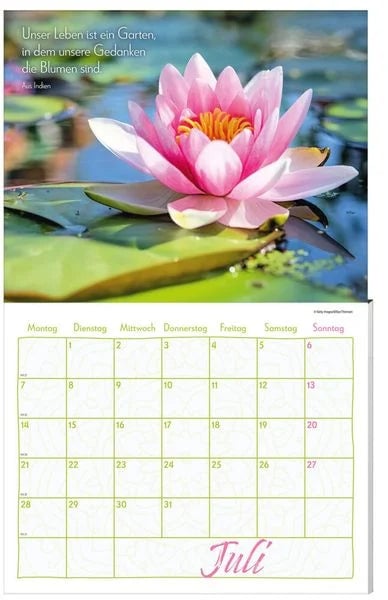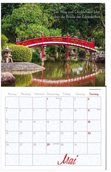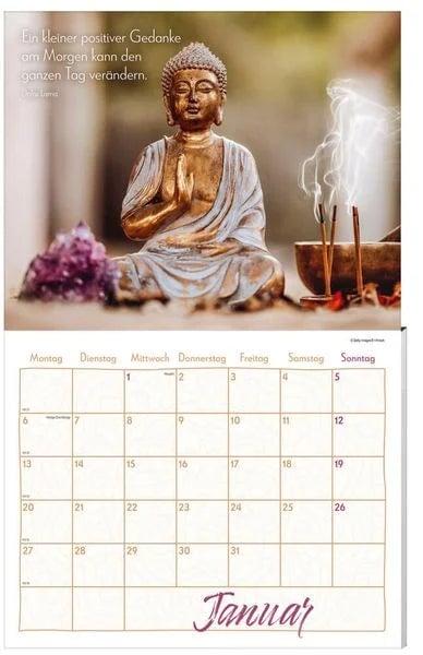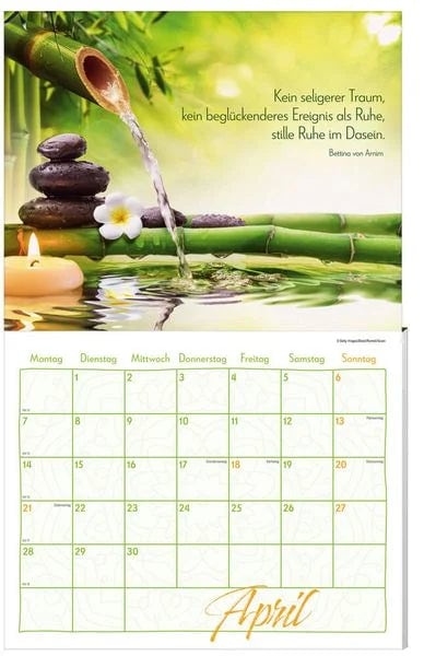 Jeden Monat mit inspirierenden Sprüchen: "Der Weg zu allem Großen geht durch die Stille." Friedrich Nietzsche, "Ein froher Sinn ist wie ein Frühling, er öffnet die Blüten der menschlichen Natur." Jean Paul, "Jetzt. Das ist es. Das ganze Ziel und der ganze Sinn des Seins." Zen-Weisheit, "Wunschlosigkeit führt zur inneren Ruhe." Laotse, Und viele mehr