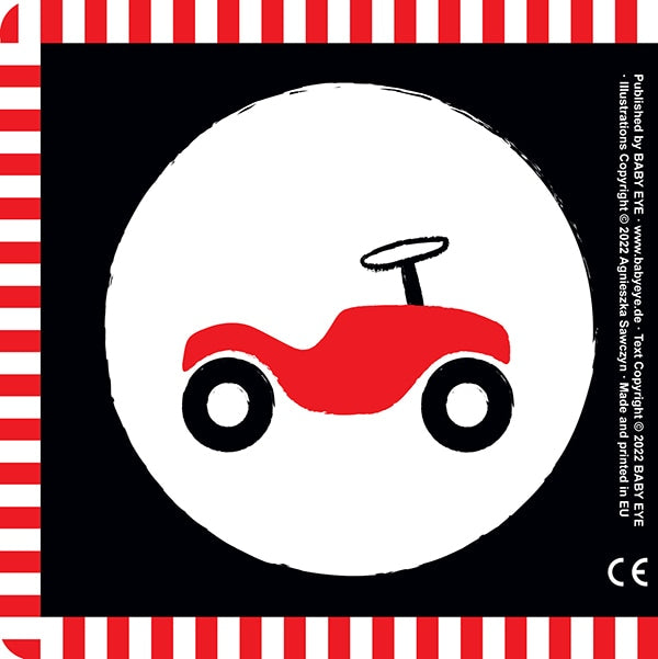 "Baby Cars" enthält kontrastreiche Illustrationen in Schwarz-Weiß und Rot. Babys kennen die Farbe Rot aus Mamas Bauch, daher ist es die erste Farbe, die sie von Geburt an erkennen können und die für Beruhigung sorgt.