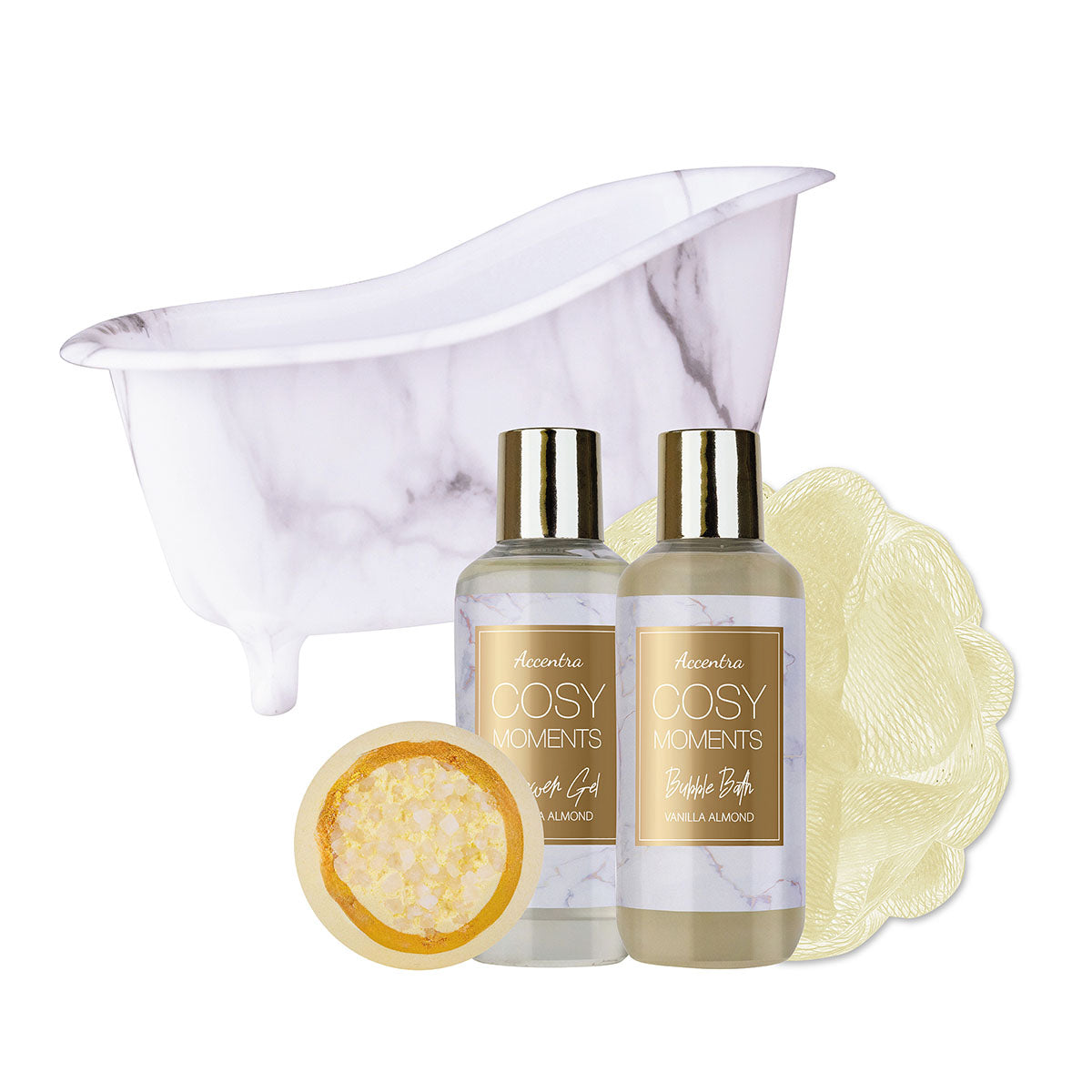 Erleben Sie pure Entspannung mit unserem luxuriösen Badeset, das in einer eleganten Badewanne mit Marmorprint präsentiert wird. Dieses Set enthält alles, was Sie für ein verwöhnendes Bad benötigen: Mit je150 ml Duschgel und Schaumbad, die Ihre Sinne mit dem süssen Duft von Vanille umhüllen, eine 90 g Badebombe für sprudelnde Freude und einen 15 g Netzschwamm für ein sanftes Peeling. Gönnen Sie sich oder Ihren Liebsten dieses Verwöhnpaket von Accentra und verwandeln Sie Ihr Badezimmer in eine Wohlfühloase.