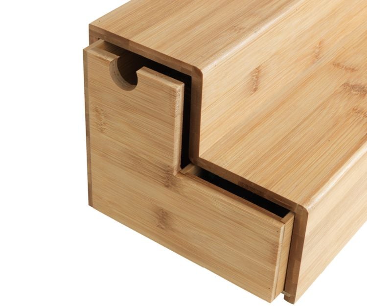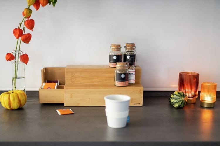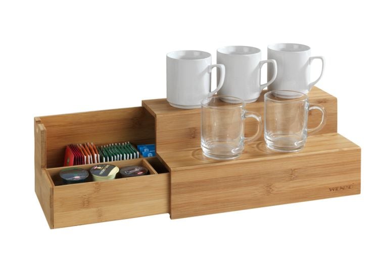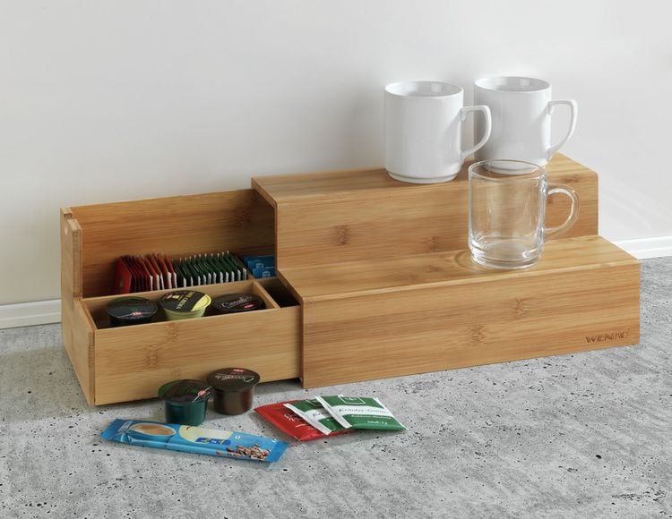 Klein aber oho: Die praktische Bambus Treppe für Kaffee und Tee von WENKO schafft mit wenig Aufwand viel Ordnung im Küchenschrank und auf der Arbeitsplatte. Das hochwertige Regal mit zwei Stufen hat eine beidseitig ausziehbare Schublade: Hier lassen sich Tee, Kaffeepads oder auch Kaffeekapseln übersichtlich und vor Staub geschützt aufbewahren und bei Bedarf bequem entnehmen. Die beiden Stufen bieten zusätzlich eine dekorative Abstellfläche für Espressotassen, Gewürze oder auch kleinere Dekorationsartikel. Das nützliche Küchenregal lässt sich mit seinen überschaubaren Maßen von (B x H x T): 33 x 17,5 x 15 cm mühelos auch in kleinere Küchen integrieren. Es ist aus robustem Bambus gefertigt: Ein schnell wachsender Rohstoff, der nicht nur hart und widerstandsfähig ist, sondern auch unter ökologischen Aspekten klare und zeitgemäße Vorteile bietet. Ein nachhaltig praktischer Küchenhelfer!