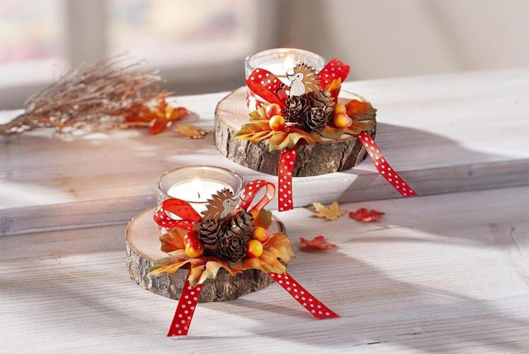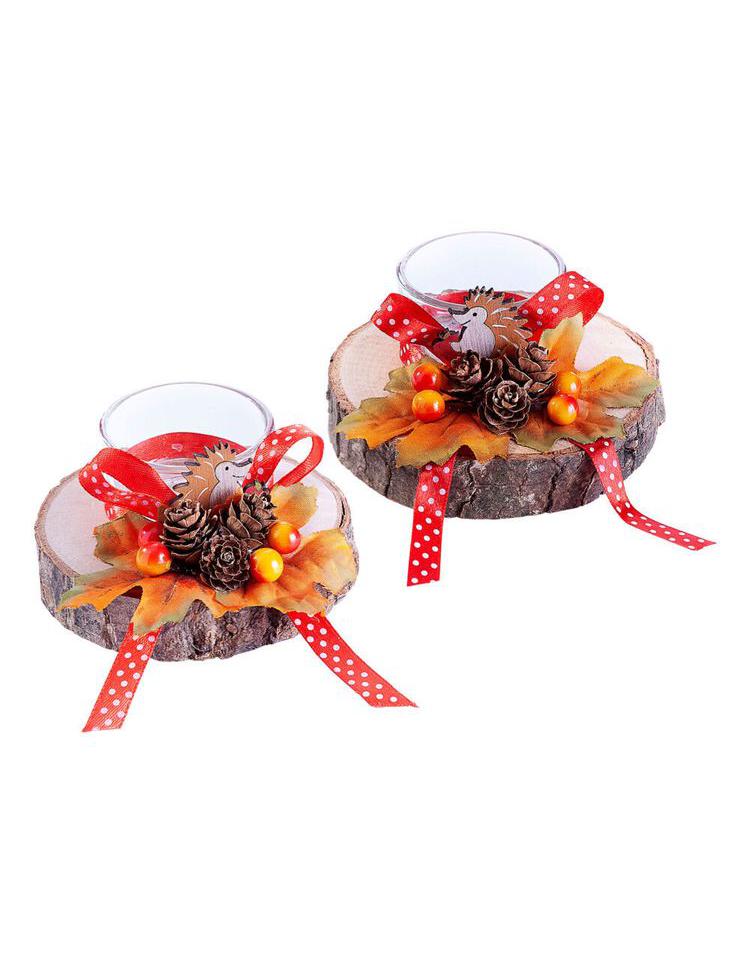 Herbstliche Lichtdeko in Holz 2er-Set, Ø je ca. 10 cm Echte Baumscheiben Je inkl. zauberhafter Herbstdeko Je mit Teelichtglas inkl. Teelicht Zauber der Natur: Baumstamm-Teelichthalter Wood im 2er-Set Ein stimmungsvoller Blickfang, der wunderbar warme Herbst-Atmosphäre in Ihr Zuhause bringt: Dieses 2er-Set von zauberhaft dekorierten Teelichthaltern begeistert durch den Material-Mix aus Naturmaterialien und liebevoll arrangierten Accessoires. Auf einer naturbelassenen Baumscheibe aus echtem Holz sind viele geschmackvoll zusammengestellte Element versammelt, die das Teelicht im Teelichtglas begleiten: Wie putzig der kleine Igel aus Holz hier das Äpfelchen in seinen Pfötchen präsentiert! Mit einem wunderbar abgestimmten Arrangement aus Tannenzapfen, textilen Ahornblättern, naturnahen Deko-Äpfelchen, eingerahmt von einer im Fliegenpilz-Look gepunkteten roten Schleife, werden die beiden dekorativen Teelichthalter zu Highlights für Esstisch, Fensterbank, Sideboard oder Beistelltisch. Ob einzeln oder paarweise dekoriert mit warmen Naturtönen und heimeligem Kerzenschein verleihen die beiden Teelichthalter-Arrangements Ihrem Zuhause eine stimmungsvoll herbstliche Atmosphäre. Wunderbar: Jeweils ein Teelicht ist bereits mit dabei. So kann Ihre neue herbstliche Lichterdeko sofort zum Einsatz kommen. Natürlich können Sie die Teelichthalter-Gläser auch mit LED-Teelichtern nutzen ideal, wenn Sie die Baumstamm-Teelichthalter auf der Fensterbank oder im Regal dekorieren. Die Teelichthalter wirken wundervoll im Duo-Arrangement als Blickfang Ihrer Tischdeko, aber auch einzeln wo immer Sie einen herbstlichen Akzent setzen möchten. Natürlich und individuell: Holz ist ein lebendiges Naturmaterial jede der Baumscheiben mit wunderbarer Maserung und naturbelassener Rinde ist ein Unikat. Geschenk-Tipp: Das 2er-Set lädt dazu ein, die Herbstfreuden zu teilen einen Teelichthalter behalten und den anderen verschenken an einen lieben Menschen! Wunderbar als Mitbringsel zur bei der nächsten Einladung zum Kaffee-Kränzchen. Baumstamm-Teelichthalter Wood im 2er-Set 2 Dekoplatten, je als fein gemaserte Baumscheibe mit Naturrinde Jedes Stück ein Unikat Je mit Teelicht-Glas Je inkl. Teelicht (Brenndauer ca. 3,5 Stunden) Je inkl. Deko-Arrangement mit Holz-Igel, textilen Kunststoff-Ahornblättern, Zapfen, Deko-Äpfelchen aus Kunststoff und roter Stoffschleife mit Punkten Maße Baumscheibe: Ø ca.9 10 cm, H 5 cm. Bestellen Sie jetzt gleich den Baumstamm-Teelichthalter Wood im 2er-Set ganz bequem bei uns im Online-Shop!.