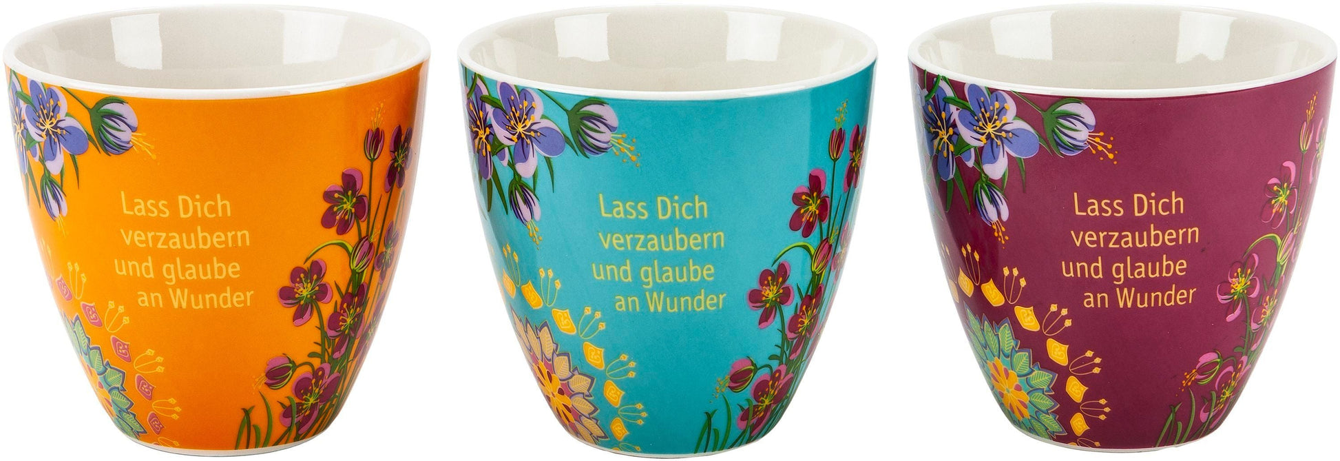 Becher, so bunt wie das pralle Leben! Das Trio kommt in drei verschiedenen Farben (türkis, orange und beere) und alle drei sind rundum mit einem zauberhaften Blumen-Dekor - inkl. eines Kolibris - geschmückt. Beidseitig sind sie jeweils mit einem gutgelaunten Spruch bedruckt: