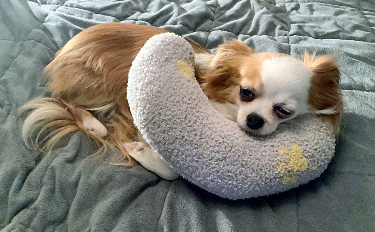 Himmlisches Hörnchen-Kissen! Es hat für Vierbeiner die optimale Höhe: Ohne Hals, Nacken oder Schulterbereich zu verspannen, können sie den Kopf darauf ablegen. Das fördert das Wohlbefinden und lässt sie schneller zur Ruhe kommen. Die Tiere müssen nicht lange nach einer angenehmen Ruheposition "nesteln". Bald schon wird ihnen das Beruhigungskissen mit seinem weichen Bezug und der angenehmen Form vertraut sein. Das ist auch hilfreich unterwegs, z.B. im Restaurants. Insbesondere nervöse Hunde finden mit Hilfe des Beruhigungskissen auch in einer unruhigen, belebten Umgebung besser zur Ruhe.