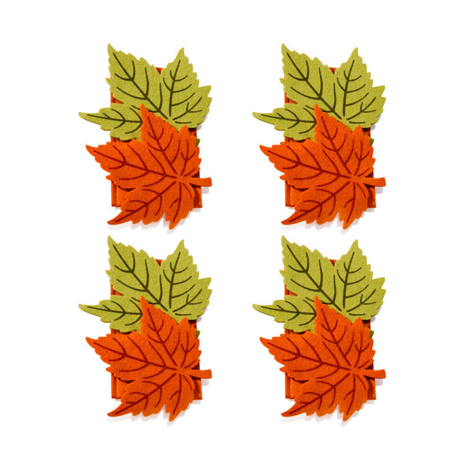 Vier Filztaschen für Besteck sind die perfekte Ergänzung für Ihren gedeckten Tisch. Jeweils mit 2 applizierten Ahornblättern in Orange und Grün, Blattsilhouetten mit aufgedruckten Adern.