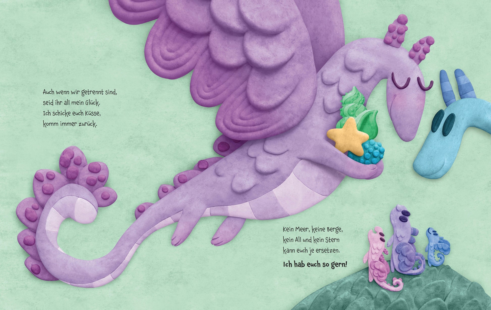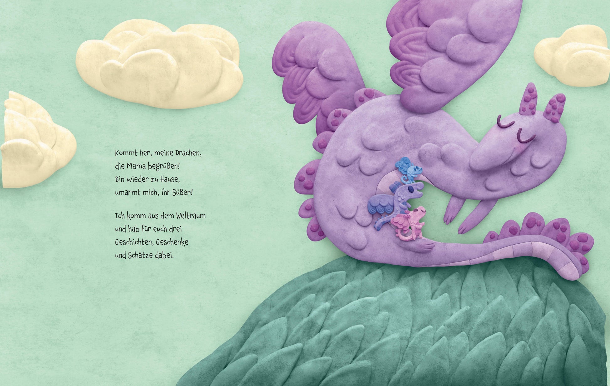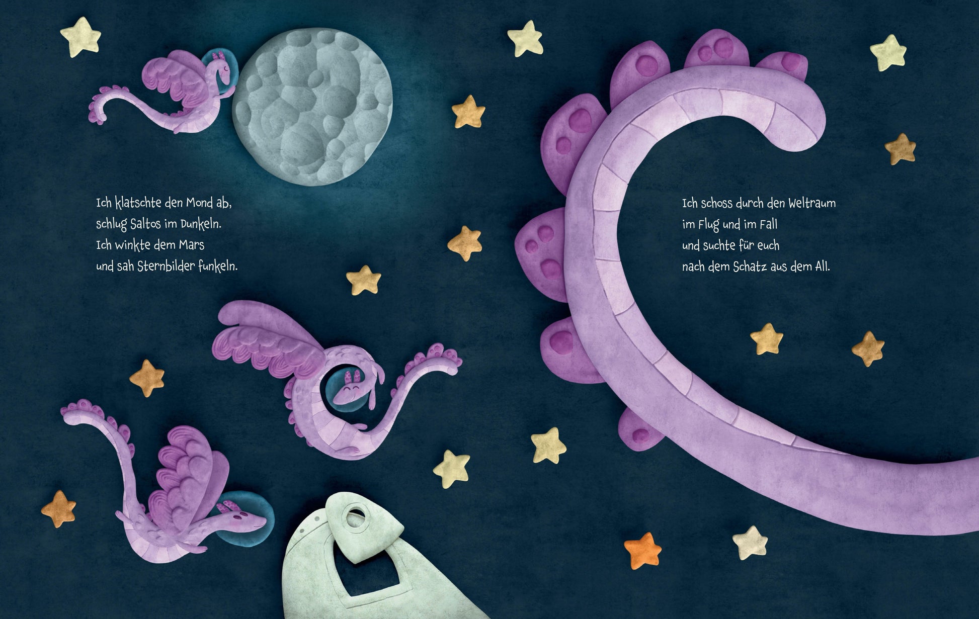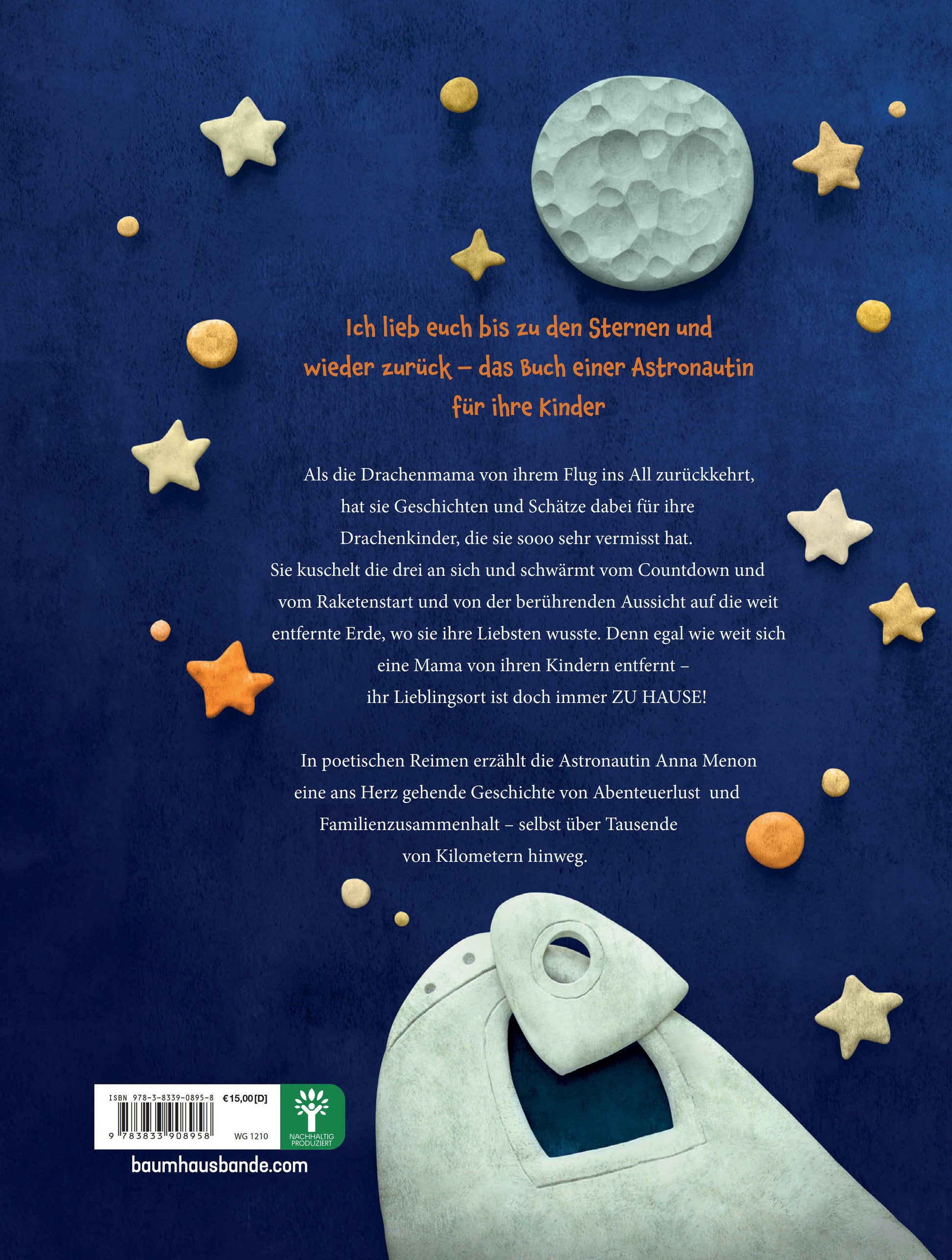 »Auch wenn wir getrennt sind, seid ihr all mein Glück. Ich schicke euch Küsse, komm immer zurück.«Als die Drachenmama von ihrem Flug ins All zurückkehrt, hat sie Geschichten und Schätze dabei für ihre drei Drachenkinder, die sie so sehr vermisst hat. Sie kuschelt die drei an sich und schwärmt vom Training hoch in den Bergen und tief im Ozean, vom Countdown und Raketenstart und der berührenden Aussicht auf die weit entfernte Erde, wo sie ihre Liebsten weiss. In poetischen Reimen erzählt die Astronautin Anna Menon eine ans Herz gehende Geschichte von Abenteuerlust und Familienzusammenhalt - selbst über viele Kilometer hinweg. Ein Buch, das nicht nur Mütter aufs Tiefste berührt.