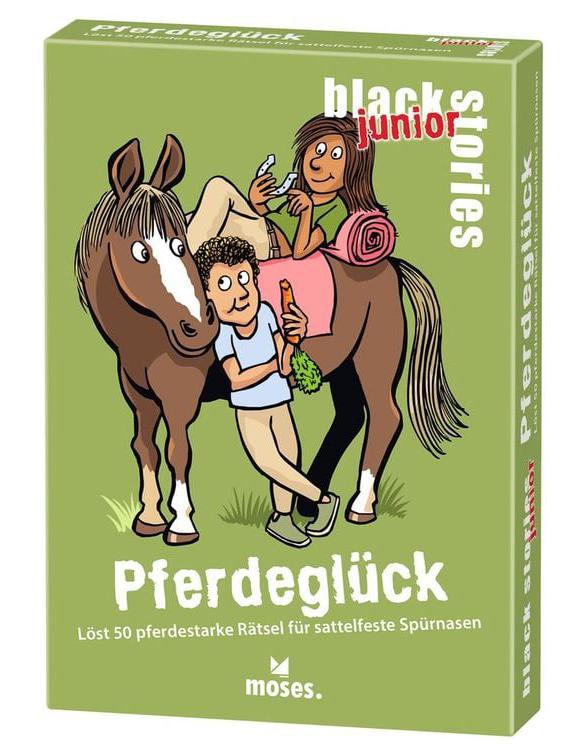Wie macht Cathleen ihren Opa zum Cowboy? Welche Unachtsamkeit brachte Laurenz mit dem süßesten Mädchen der Welt zusammen? Und wieso wäre Ritter Hauweg fast ertrunken, als sein Pferd scheute? Wenn es sich um gruselige Geisterpferde dreht, Misthaufen plötzlich explodieren oder Ponys in Lebensgefahr sind, dann ist es Zeit für eine Runde black stories junior. Den Geheimnissen dieser 50 pferdestarken Rategeschichten rund um gefälschte Fellfarben und verpatzte Reiterferien kann man nur durch Fragen, Rätseln, Tüfteln und um die Ecke denken auf die Spur kommen. Ratespaß garantiert – nicht nur für Pferdefans! So wird’s gespielt: Die black stories junior sind spannende Rätselgeschichten auf Karten, die es gemeinschaftlich zu knacken gilt. Nur der*die Expeditionsleiter*in kennt des Rätsels Lösung, denn er*sie liest das Rätsel auf der Vorderseite laut vor und darf zudem auch die Lösung auf der Rückseite genauestens studieren. Die Abenteurer*innen versuchen nun durch Fragen, Raten und Tüfteln der Lösung Schritt für Schritt auf die Spur zu kommen. Neue Spielvariante: Pro Spiel wird eine Rätselkarte gelöst. Nur die Spielleitung kennt die Lösung und das Rateteam nähert sich dieser Schritt für Schritt durch Fragen, Raten und Tüfteln ... wie gewohnt! Aber aufgepasst: Besonders clevere Fragen, die auf eine heiße Fährte führen, werden mit Punktechips belohnt. Der Ratefuchs, der das Rätsel löst, erhält zusätzlich 3 Punktechips. Wer am Ende des Spiels die meisten Punktechips gesammelt hat, gewinnt!
