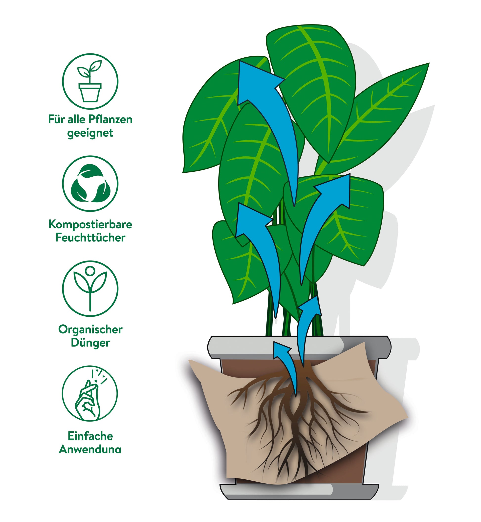 Wie Erfrischungstücher für Ihre Pflanzen – so wirken die Blattgold Düngetücher. Wurzel, Blüte und Stiel erhalten dank der kompostierbaren Feuchttücher frische, natürliche Kraft und erblühen zu neuem Leben. Sie bestehen zudem zu 100 % aus organischem Dünger und versorgen deine Pflanzen kontinuierlich mit wichtigen Nährstoffen. Mangelerscheinungen gehen die Düngetücher dort an, wo sie entstehen: direkt an der Wurzel. Bei gesunden Pflanzen beugen die Düngetücher einem Nährstoffmangel vor. Mit nur ein bis zwei Feuchttüchern pro Wurzelballen sparen Sie Kraft und Zeit und geniessen die Schönheit Ihrer Pflanze.