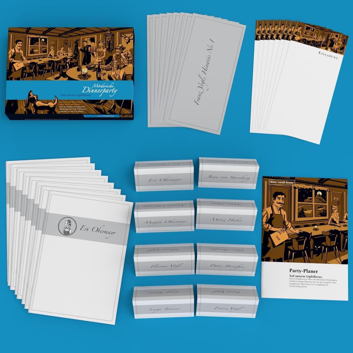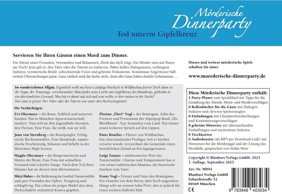 Im wunderschönen Allgäu. Eigentlich wollt ma heut a zünftige Hochzeit in Wildbachau feiern. Doch dann ist der Seppi, der Trauzeuge, verschwunden! Man findet seine Leiche am Gipfelkreuz des Hausbergs, gekleidet in ein altertümliches Gewand. Was hat es damit auf sich und was wollte er dort mitten in der Nacht? Nur oans is g'wiss: Der Täter oder die Täterin war unter den Hochzeitsgästen!Die Mörderische Dinnerparty ist ein Krimidinner für Zuhause. Ein Abend unter Freunden, Verwandten und Bekannten. Doch das Idyll trügt: Ein Mörder sitzt mit Ihnen zu Tisch! Jetzt gilt es, den Täter zu entlarven. Dabei helfen Dialogszenen, verborgene Indizien, verräterische Briefe, schockierende Fotos und geheime Dokumente. Und eine Stimme, die weitere Überraschungen parat hält. Ganz einfach wird die Sache nicht, denn jeder der Gäste hat ein dunkles Geheimnis...
