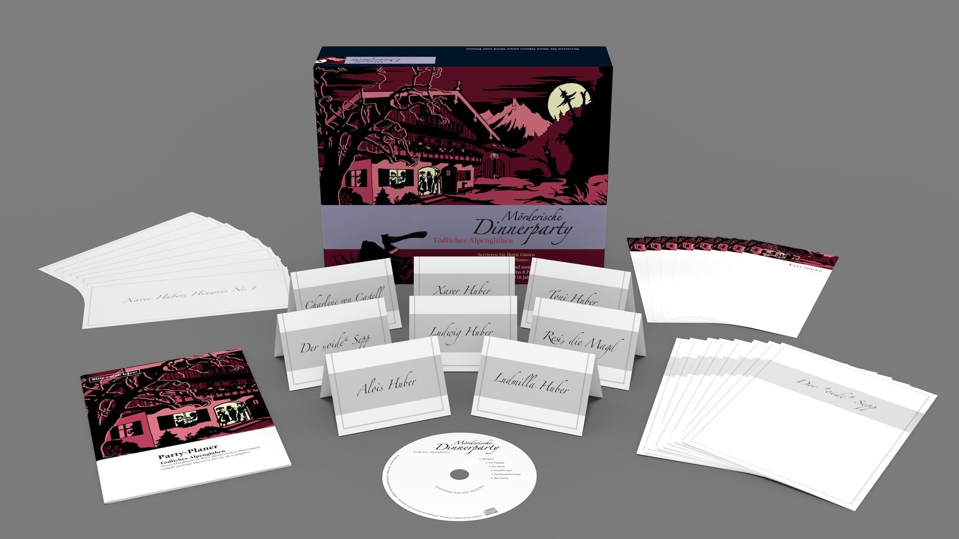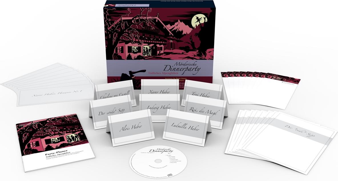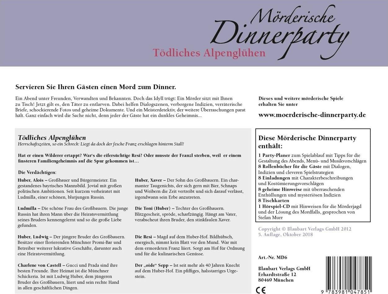 Mörderische Dinnerparty Tödliches Alpenglühen Herrschaftszeiten, so ein Schreck. Liegt doch der fesche Franz erschlagen hinterm Stall. Hat er einen Wilderer ertappt? War's die eifersüchtige Resi? Oder musste der Franzl sterben, weil er einem finsteren Familiengeheimnis auf die Spur gekommen ist. Für 6 bis 8 Spieler ab 16 Jahren. Spieldauer: 180 bis 240 Minuten.
