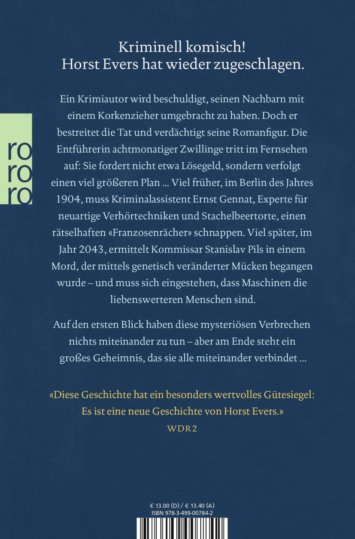 Kriminell komisch: Horst Evers hat wieder zugeschlagen. Der Bestseller jetzt als Taschenbuch! «Horst Evers' Bücher sind nichts für die U-Bahn. Man muss dabei so sehr lachen, dass es echt peinlich wird. Sogar in Berlin.» Berliner ZeitungEin Krimiautor wird beschuldigt, seinen Nachbarn mit einem Korkenzieher umgebracht zu haben. Doch er bestreitet die Tat und verdächtigt seine Romanfigur. Die Entführerin achtmonatiger Zwillinge tritt im Fernsehen auf: Sie fordert nicht etwa Lösegeld, sondern verfolgt einen viel grösseren Plan ... Viel früher, im Berlin des Jahres 1904, muss Kriminalassistent Ernst Gennat, Experte für neuartige Verhörtechniken und Stachelbeertorte, einen rätselhaften «Franzosenrächer» schnappen. Viel später, im Jahr 2043, ermittelt Kommissar Stanislav Pils in einem Mord, der mittels genetisch veränderter Mücken begangen wurde - und muss sich eingestehen, dass Maschinen die liebenswerteren Menschen sind.