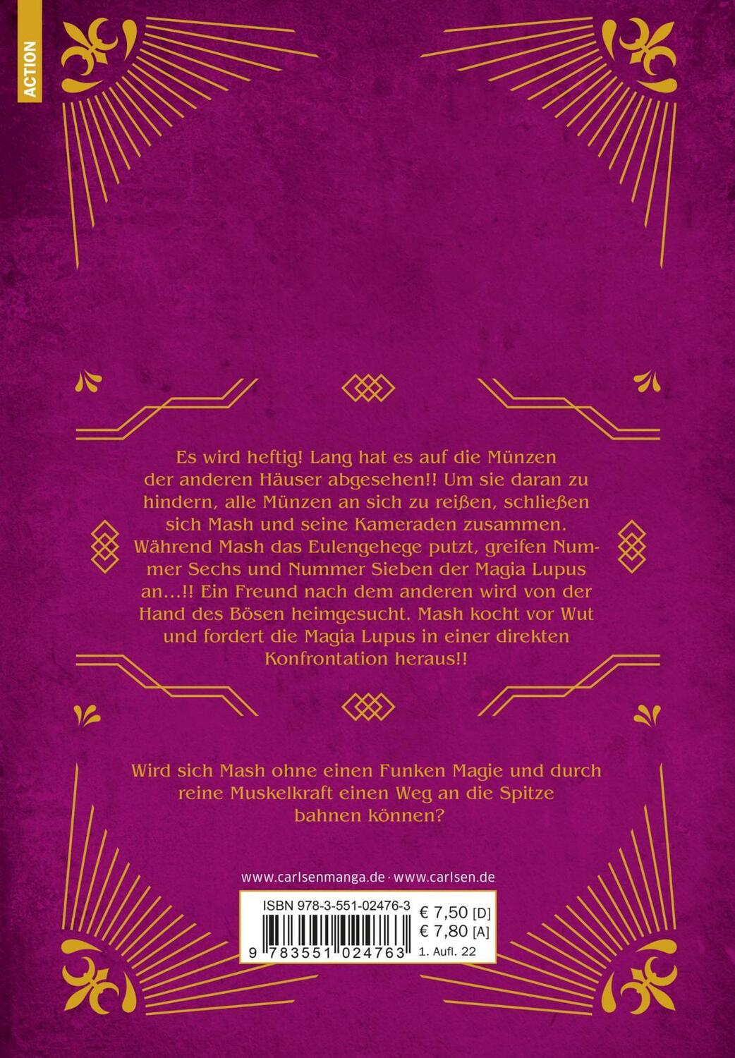 Es wird heftig! Lang hat es auf die Münzen der anderen Häuser abgesehen!! Um sie daran zu hindern, alle Münzen an sich zu reißen, schließen sich Mash und seine Kameraden zusammen. Während Mash das Eulengehege putzt, greifen Nummer Sechs und Nummer Sieben der Magia Lupus an...!! Ein Freund nach dem anderen wird von der Hand des Bösen heimgesucht. Mash kocht vor Wut und fordert die Magia Lupus in einer direkten Konfrontation heraus!!