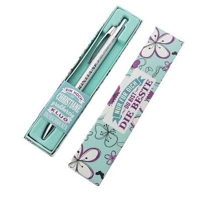 Zu jedem Anlass ein hochwertiger Kugelschreiber eine aufmerksame Geschenkidee – vor allem, wenn er mit dem Namen des Beschenkten personalisiert ist. Unsere ansprechende Auswahl an Kulis, in edlem Geschenketui mit originellem Spruch, wird stilbewusste Ladies und echte Kerle begeistern. Ausdrucksstarke, maskuline Designs mit insgesamt 50 Männernamen, feminine Muster für die 50 Frauennamen und 20 allgemeine Titel machen das neue Sortiment an kreativ gestalteten H&H Kugelschreibern aus. Die Kulis liegen angenehm in der Hand und sorgen für ein elegantes Schriftbild.