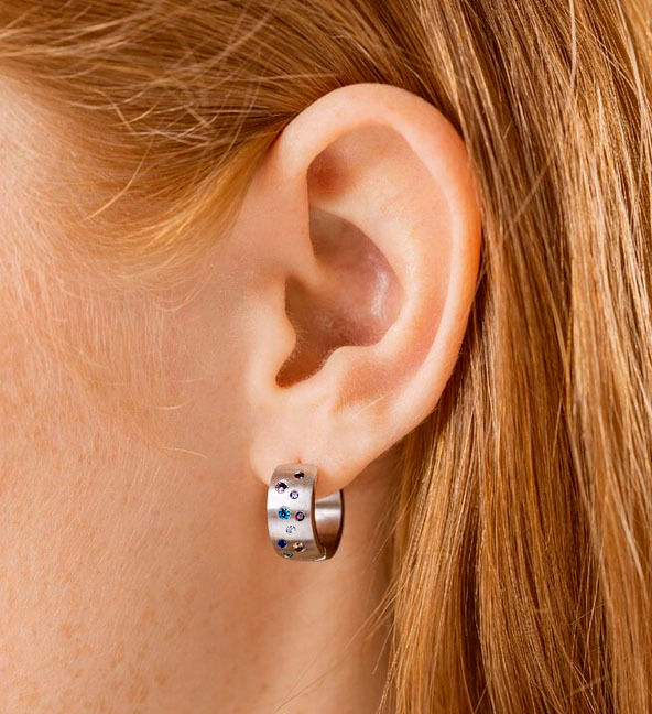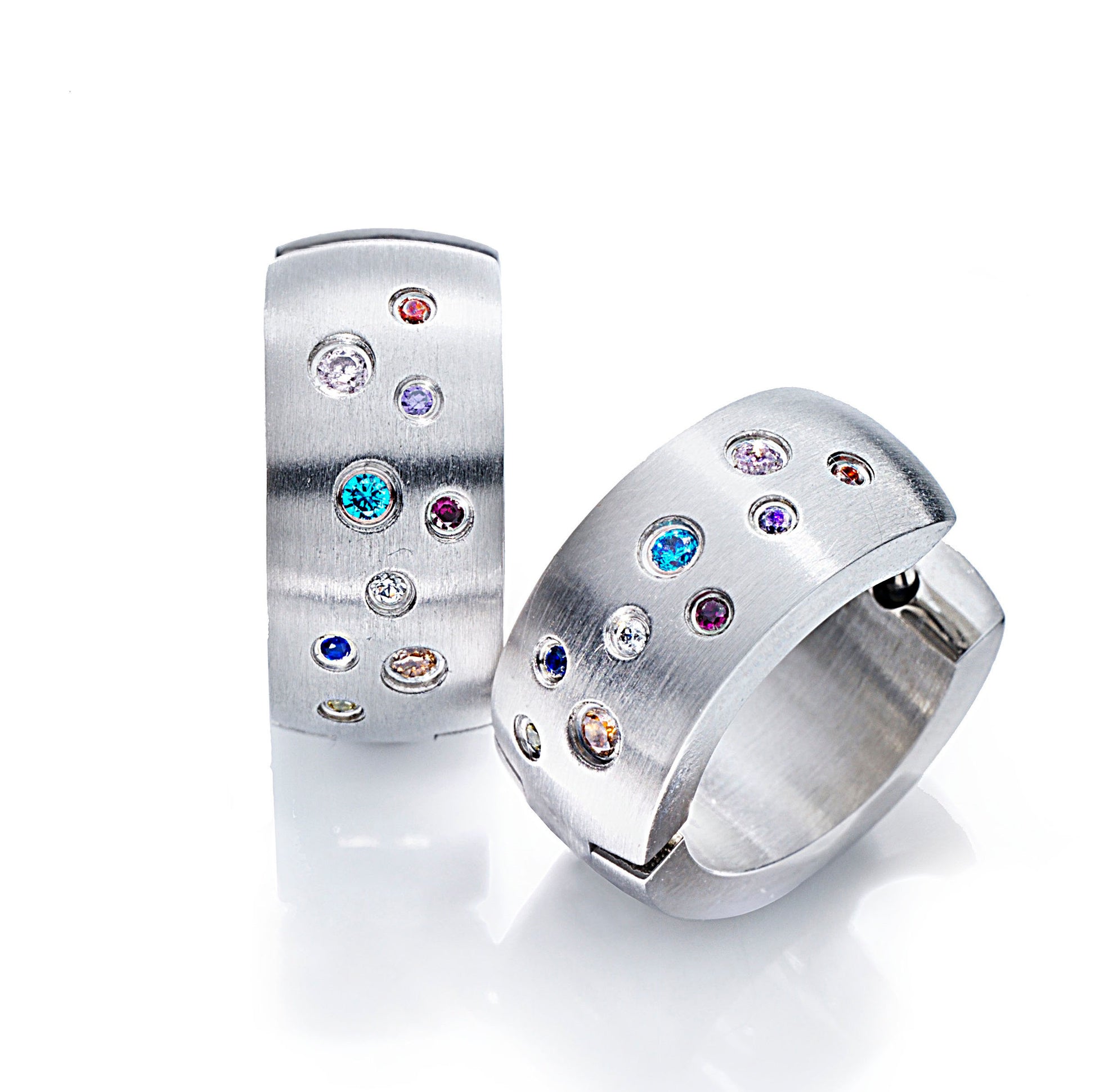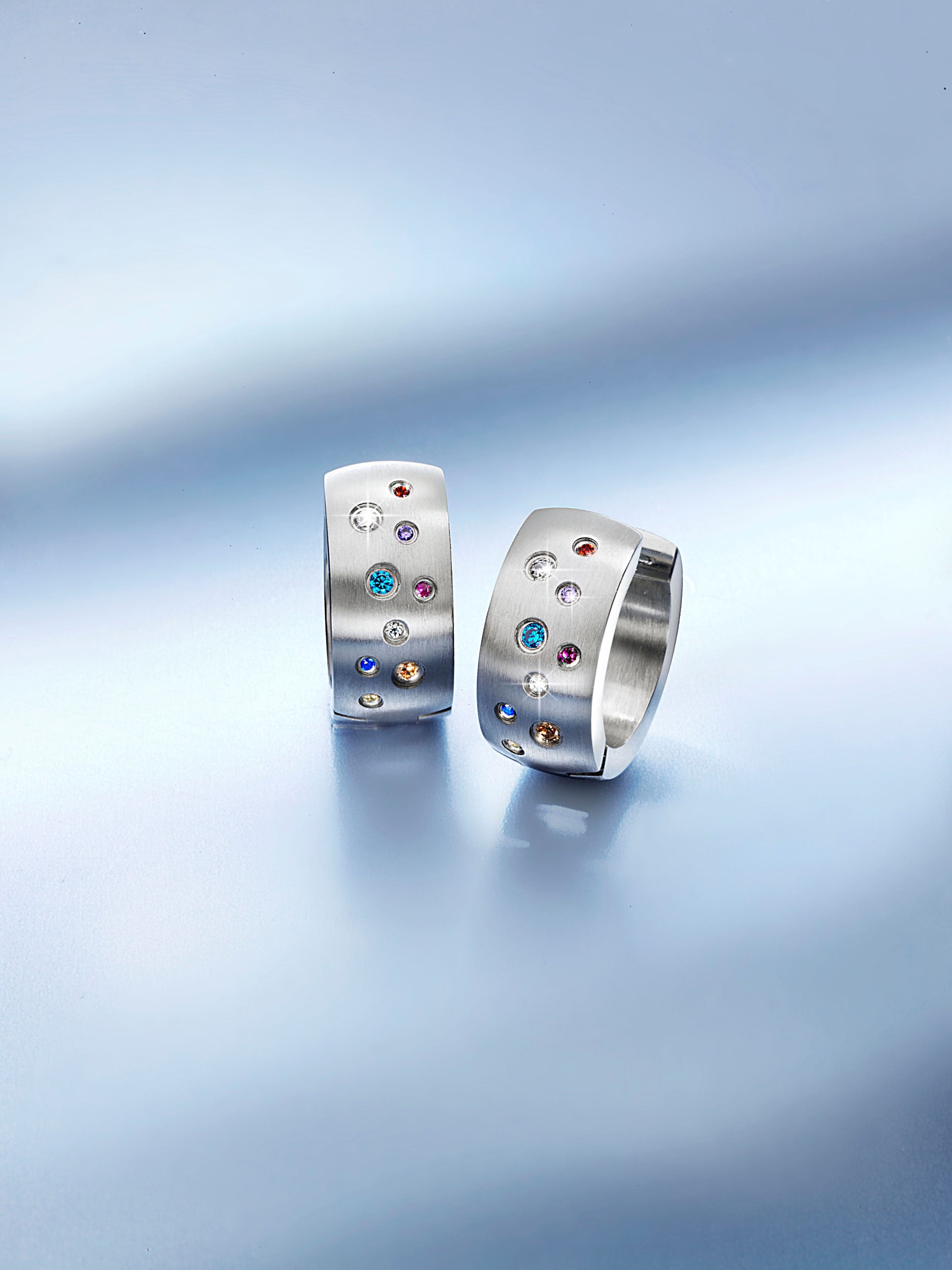 Edelstahl trifft auf glitzernde Kristalle: Ein faszinierender Reigen von feinem Schimmer und farbenprächtigem Funkeln. Auf jeder Creole zieren 9 geschliffene Zirkonia die Vorderseite. Wie ein bunter Sternenhimmel glitzern die facettierten Steine bei jeder Bewegung – sowohl untertags im Sonnenschein als auch abends bei gedämpfter Beleuchtung. Dennoch ist das Funkeln dezent genug, dass Sie die Ohrringe auch in Ihrem Berufsalltag jederzeit tragen können. Klassische Creolen mit dem gewissen Etwas: Könnten das vielleicht Ihre neuen Lieblingsstücke werden?
