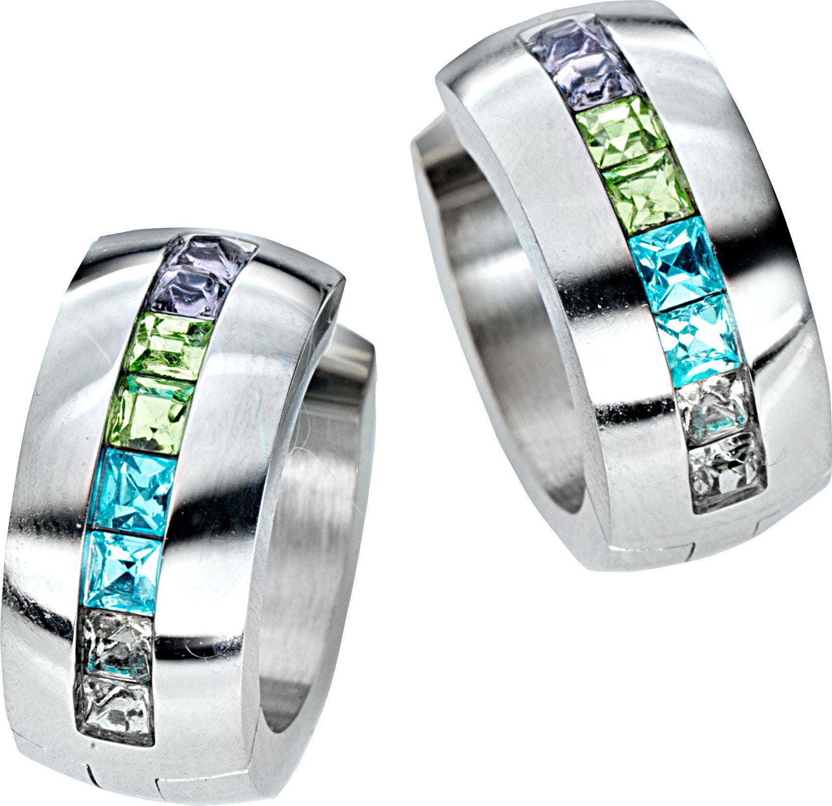 Edelstahl trifft auf farbintensive Kristalle: Ein faszinierender Reigen von feinem Schimmer und festlichem Funkeln. Jede Creole ist mittig mit einer Reihe von Kristallsteinen in Grün- und Blau-Tönen besetzt. Mal schimmert es Türkis wie das Meer, dann wieder Hellgrün wie der Sommerwald. Die facettierten Steine funkeln bei jeder Bewegung – sowohl untertags im Sonnenschein als auch abends bei gedämpfter Beleuchtung. Dennoch ist das Funkeln dezent genug, dass Sie die Ohrringe auch in Ihrem Berufsalltag jederzeit tragen können.