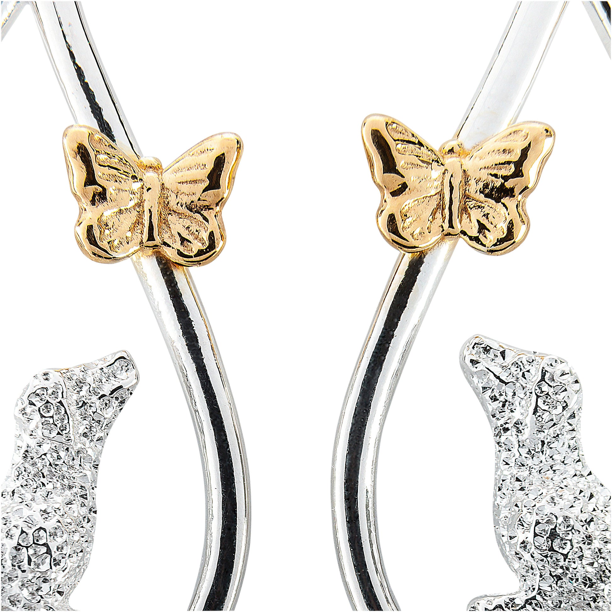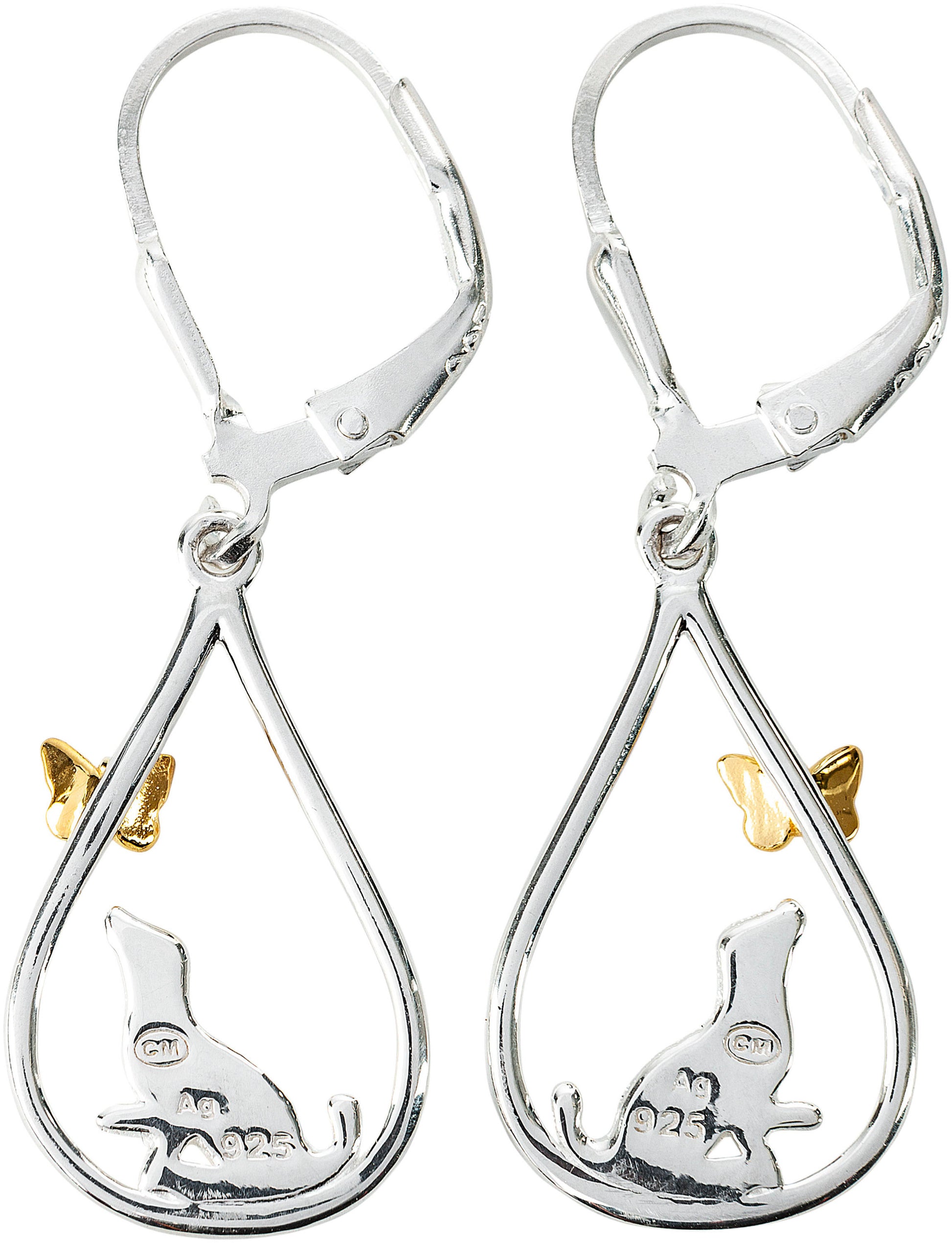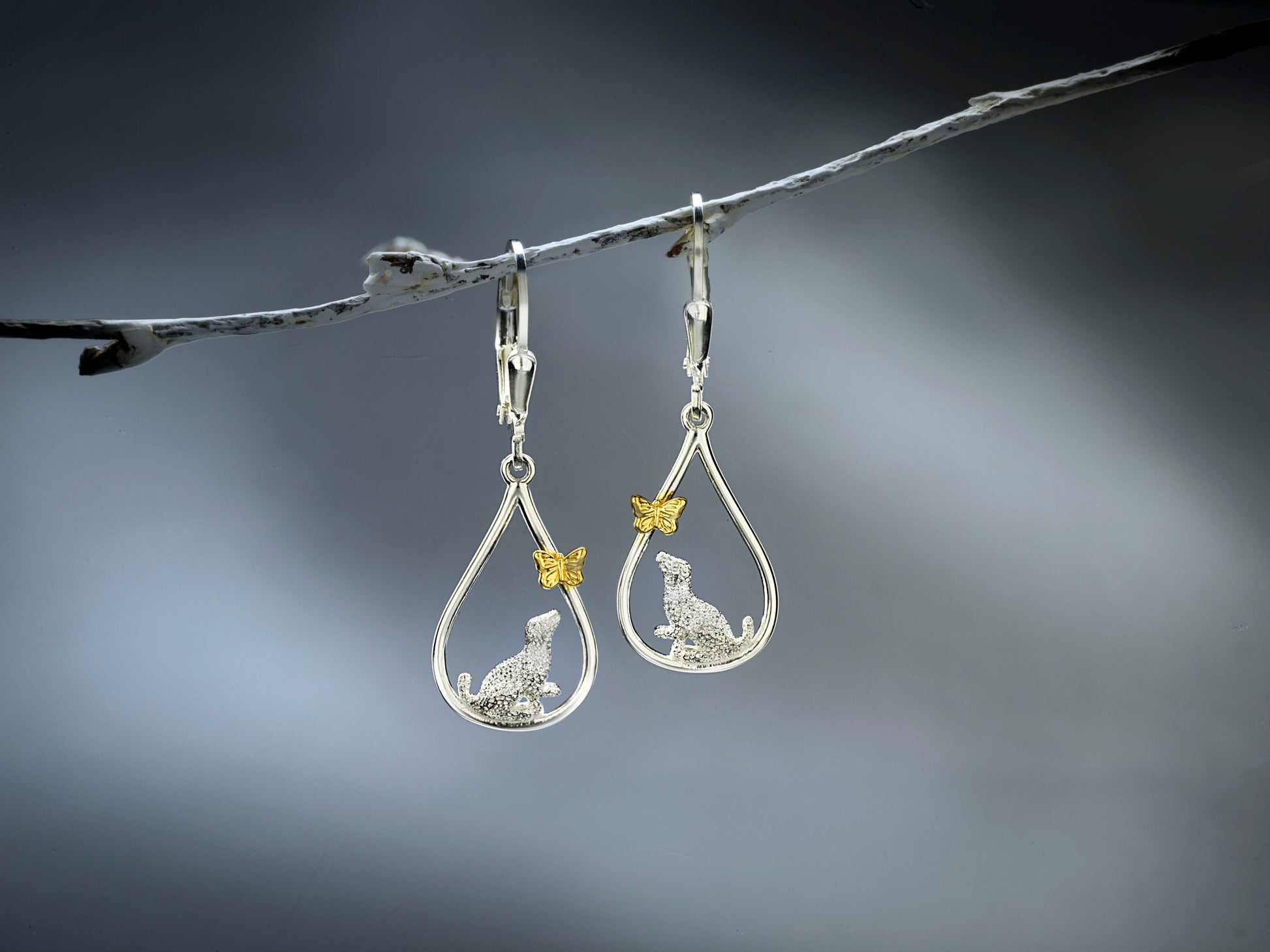 Nicht nur Hundefans werden von diesem Ohrschmuck begeistert sein: Für ihn wurden eine kleine Hundefigur und sein Freund Schmetterling plastisch ausgearbeitet. Der Falter ist zudem vergoldet.