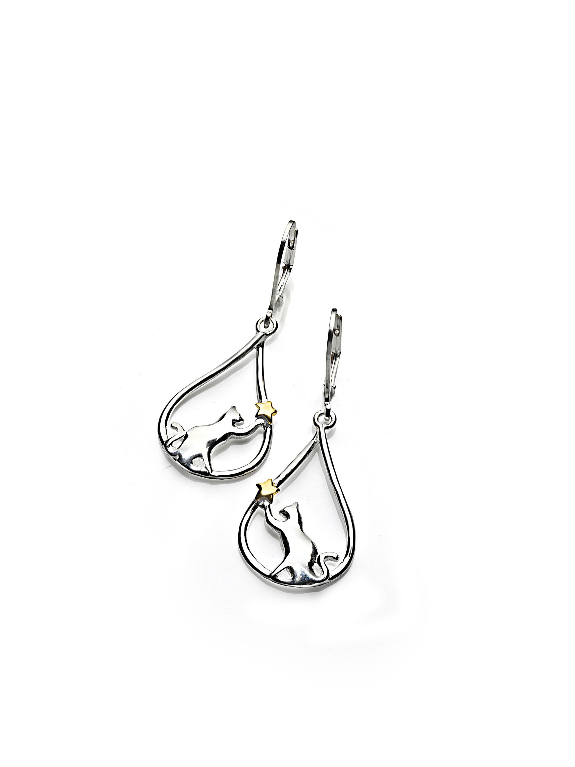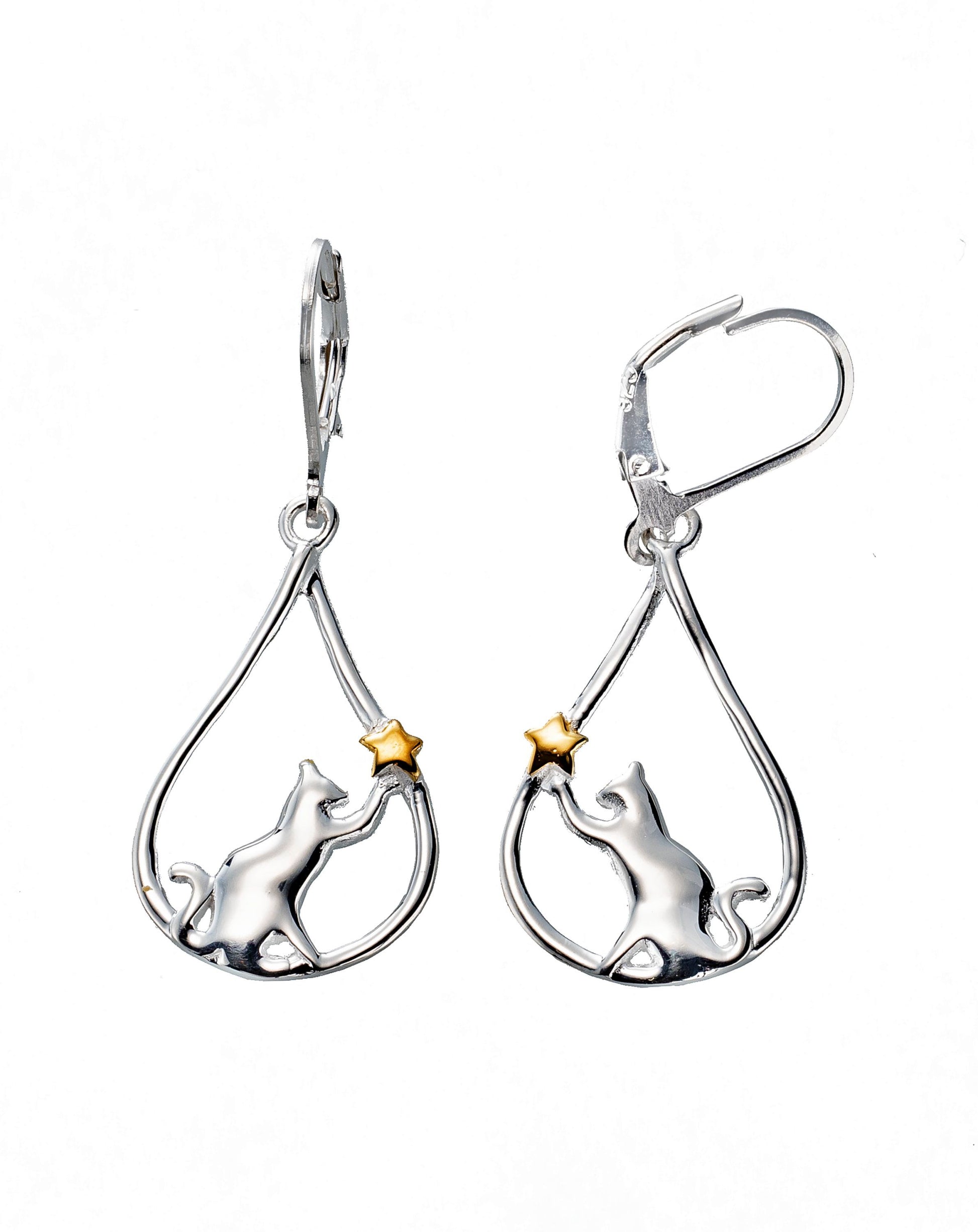 Ein verspielter Blickfang am Ohr! Diese Ohrringe im luftig-leichten Design begleiten Sie Tag für Tag und passen zu jeder Garderobe. Nicht nur Katzen-Fans werden begeistert sein von dem entzückenden Motiv: Das Silberkätzchen hascht nach dem goldenen Stern und erreicht ihn mit seinen Pfötchen. Durch den beweglichen Anhänger in Tropfenform folgen die Ohrhänger jeder Ihrer Bewegungen. Das erweckt das Motiv zum Leben – es scheint als ob das Kätzchen sich immer wieder aufs Neue nach dem Stern reckt!