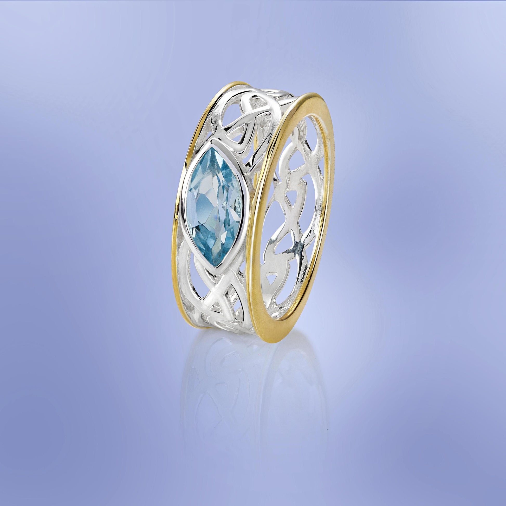 Wunderschön kombiniert: Luftige keltische Knoten winden sich verspielt zwischen zwei schlichten Reifen, die effektvoll vergoldet sind. Gekrönt wird das kunstvolle Design von einem echten Topas! Der blaue Edelstein glänzt in einer vergoldeten Fassung und setzt einen exklusiven Akzent.