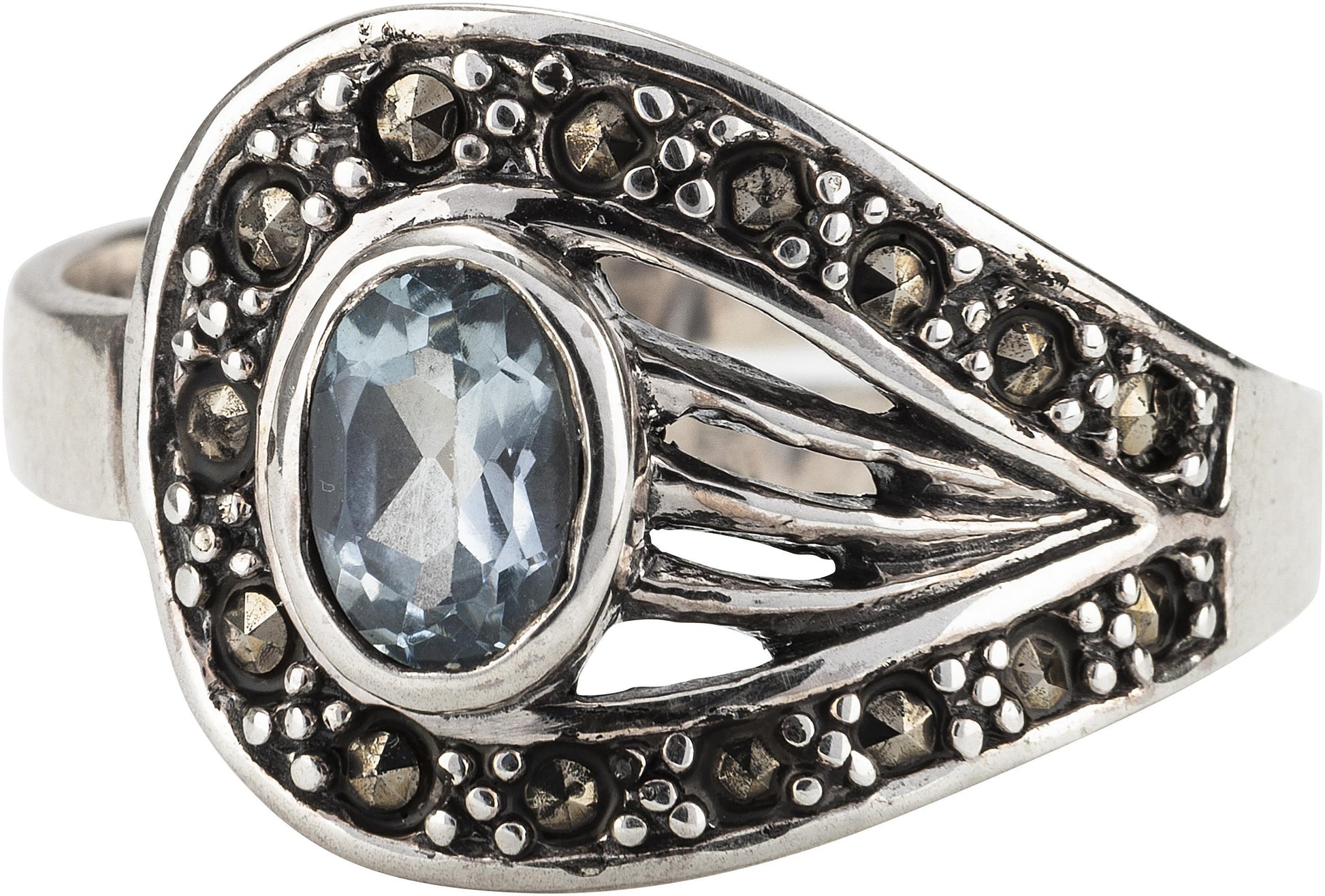 Eine aparter Kombination: Funkelnder Topas trifft auf schimmernde Markasite und glänzendes Silber – das zieht alle Blicke an! Der grosse, aquafarbene Edelstein ist aufwendig im Facetteschliff bearbeitet das verleiht ihm dieses besondere Glitzern. Die ovale Form ist perfekt eingebittet in ein breites Silberband, das mit Markasiten besetzt ist. Schmale Silberstränge ergänzen das Design und verleihen dem Ring Klasse.