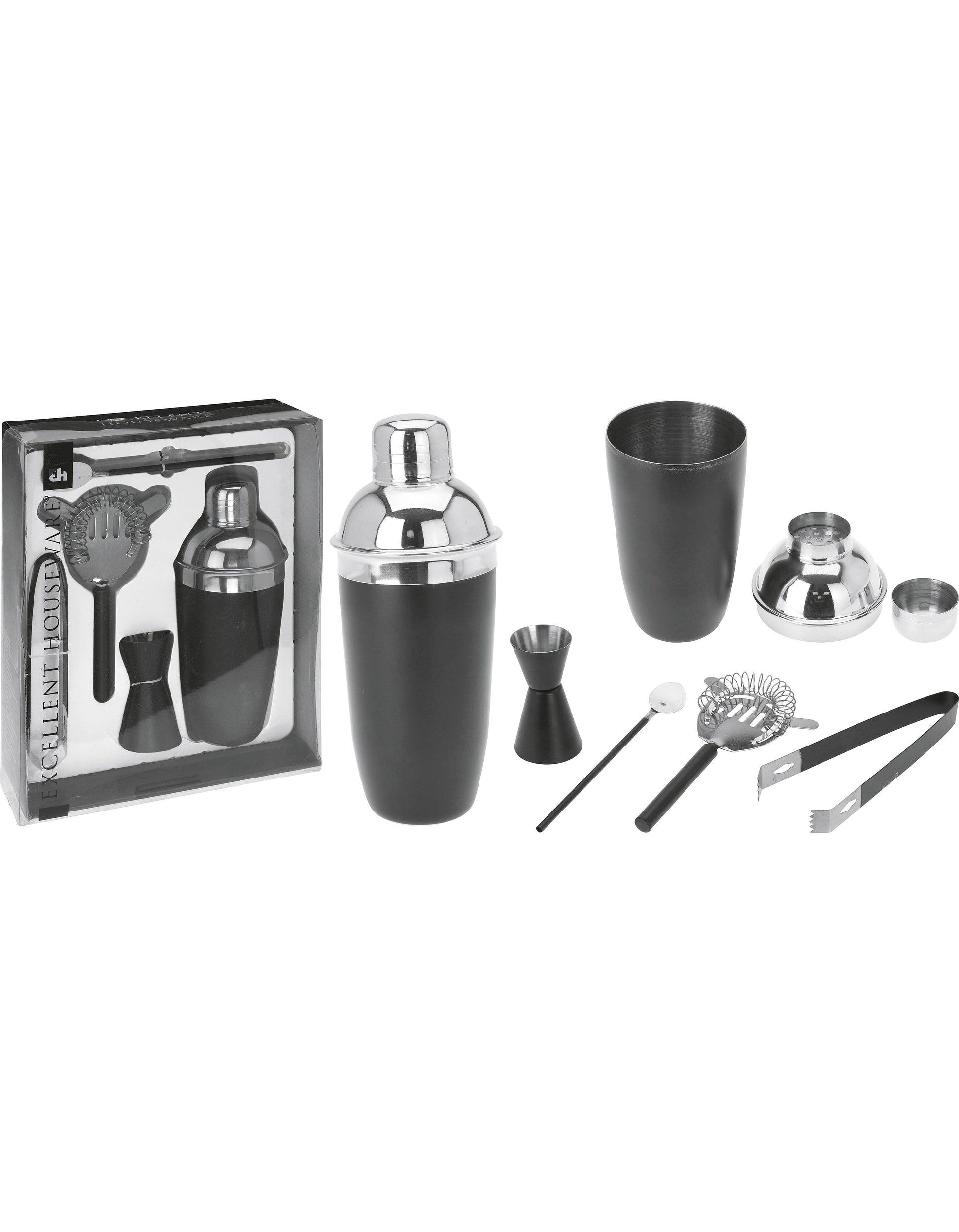 Edelstahl Shaker. Set bestehend aus: 1 Shaker, 2 Deckel, 1 Löffel, 1 Messbecher, 1 Eiszange, 1 Filter.