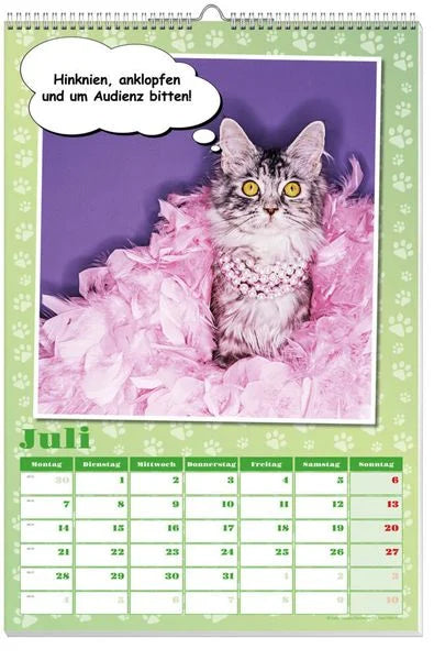 Jeder Katzenfreund weiß: Unsere Stubentiger haben das Zeug zum Komiker! Die hinreißend putzigen und lustigen Fotos und Fotocollagen des Posterkalenders mit verschiedenen Samtnasen werden zusammen mit lustigen, coolen Sprüchen in Szene gesetzt: "Einer von uns ist schlauer als du" , "Katzen liegen nicht faul herum, sie verschönern die Wohnung", "Kennst du das? Morgens aufstehen und direkt superfit sein? Ich auch nicht!" ...