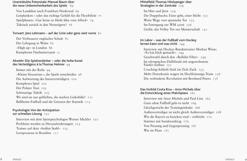 Heutzutage möchte der Fußballinteressierte nicht nur Ergebnis und Torschützen einer Partie kennen, er will das Spiel verstehen. Anhand zahlreicher Experten-Interviews, Spielanalysen und Anekdoten geben die Autoren einen Einblick in aktuelle fußballtaktische Grundlagen und beantworten Detailfragen. In jedem Kapitel kommt ein anderer Trainer zu Wort, es werden ganz unterschiedliche taktische Grundordnungen vorgestellt - so kann das Buch entweder als Ganzes oder je nach Interesse auch nur kapitelweise gelesen werden