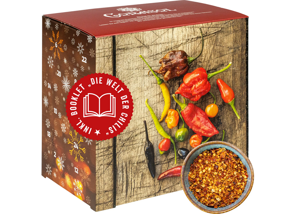 Von den Bergregionen Mexikos über die baskischen Ebenen bis tief in den indischen Subkontinent - die Chili ist auf der ganzen Welt zu Hause und kitzelt die Gaumen der Menschheit seit Urzeiten mit ihrem feurigen Geschmack. Inzwischen existieren unzählige Arten, Züchtungen und Sorten und die besten, seltensten und natürlich schärfsten 24 Spezialitäten sind in unserem Chili-Adventskalender für Sie vereint.