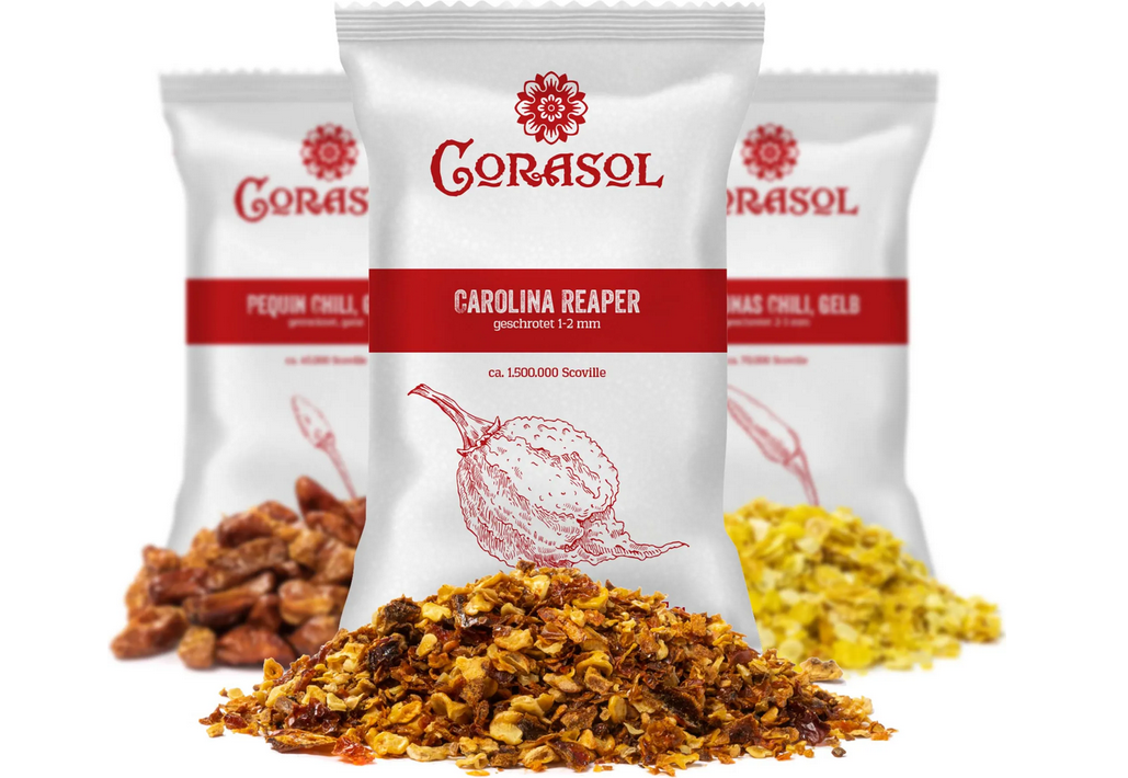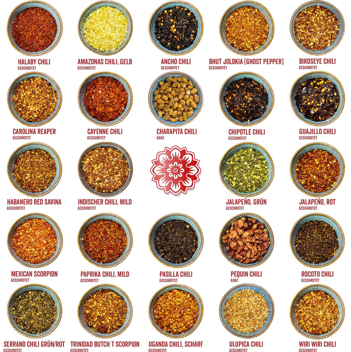 - Vielfältige Aromen: Geniessen Sie 24 besondere Chilisorten von fruchtig-mild bis höllisch scharf! Perfekt für die direkte Verwendung in der Küche als 22 geschrotet sowie 2 ganze getrocknete Chilisorten.