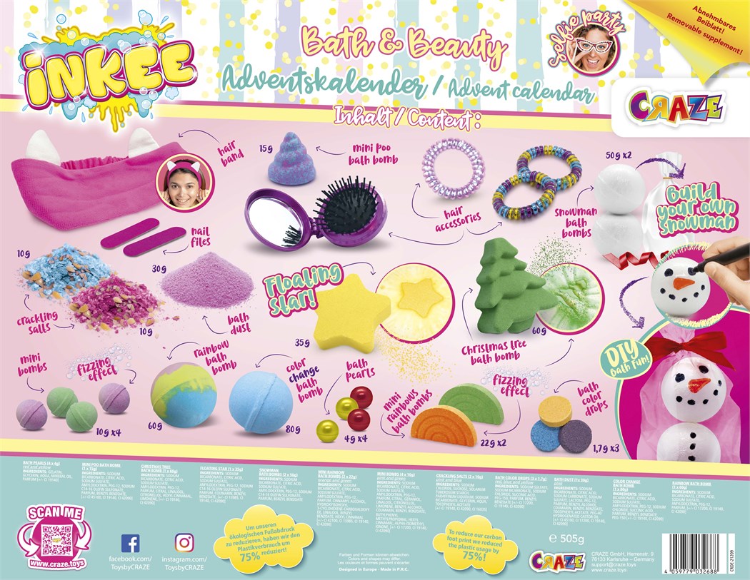 Mit dem Craze Adventskalender Inkee Badespass macht die Weihnachtszeit noch mehr Spass. Jeden Tag gibts eine Überraschung insgesamt 24 verschiedene Artikel aus den Bereichen Schönheit und Badespass Perfekt als Geschenkidee!