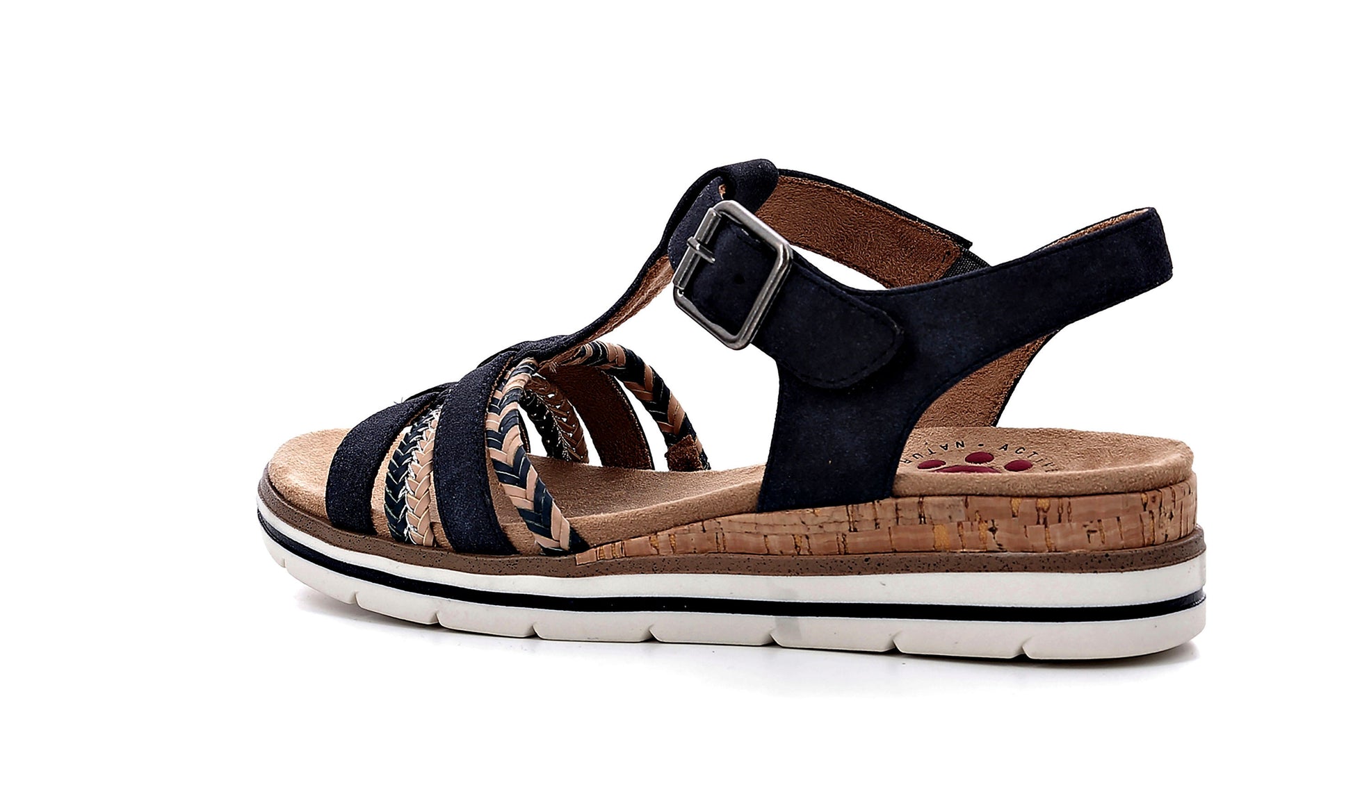 Diese hübsche Damen-Sandale „Lilly“, blau ist ihr idealer Wegbegleiter durch den Sommer – luftig leicht und passend zu jedem Look! Ein Hingucker sind die geflochtenen Riemen über den Zehen und der Steg über dem Rist. Für den bequemen Look sorgt die Metallschliesse mit Elastik-Einsatz an der Lasche. Das Obermaterial aus hochwertigem Lederimitat. Futter und Innensohle aus recycelten PET-Flaschen. Die Damen-Sandale "Lilly", blau besitzt ein vorgeformtes Fussbett. Die flexible, leichte Laufsohle in Schicht-Optik überezugt modisch mit einem 2 cm hohem Keilabsatz. Weite G.
