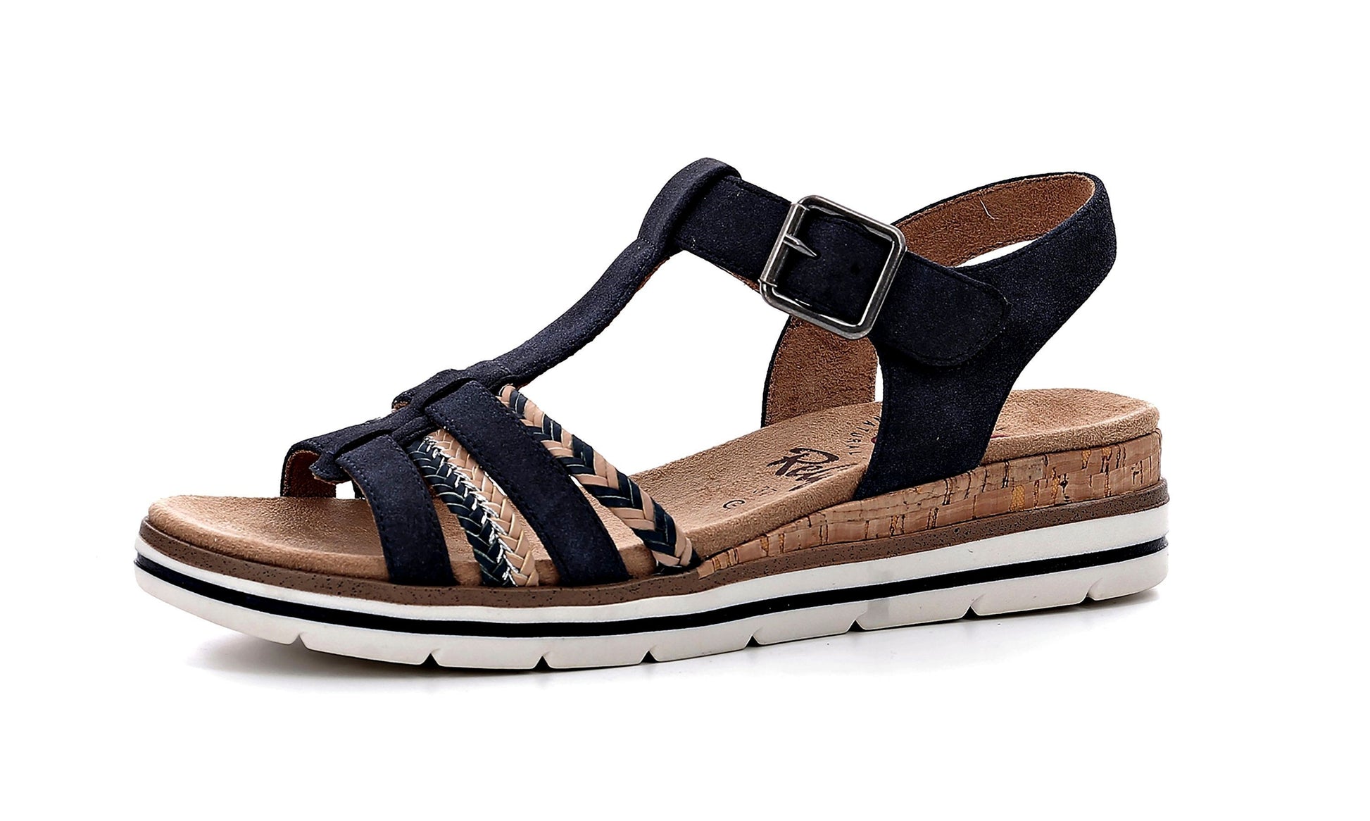 Diese hübsche Damen-Sandale „Lilly“, blau ist ihr idealer Wegbegleiter durch den Sommer – luftig leicht und passend zu jedem Look! Ein Hingucker sind die geflochtenen Riemen über den Zehen und der Steg über dem Rist. Für den bequemen Look sorgt die Metallschliesse mit Elastik-Einsatz an der Lasche. Das Obermaterial aus hochwertigem Lederimitat. Futter und Innensohle aus recycelten PET-Flaschen. Die Damen-Sandale "Lilly", blau besitzt ein vorgeformtes Fussbett. Die flexible, leichte Laufsohle in Schicht-Optik überezugt modisch mit einem 2 cm hohem Keilabsatz. Weite G.