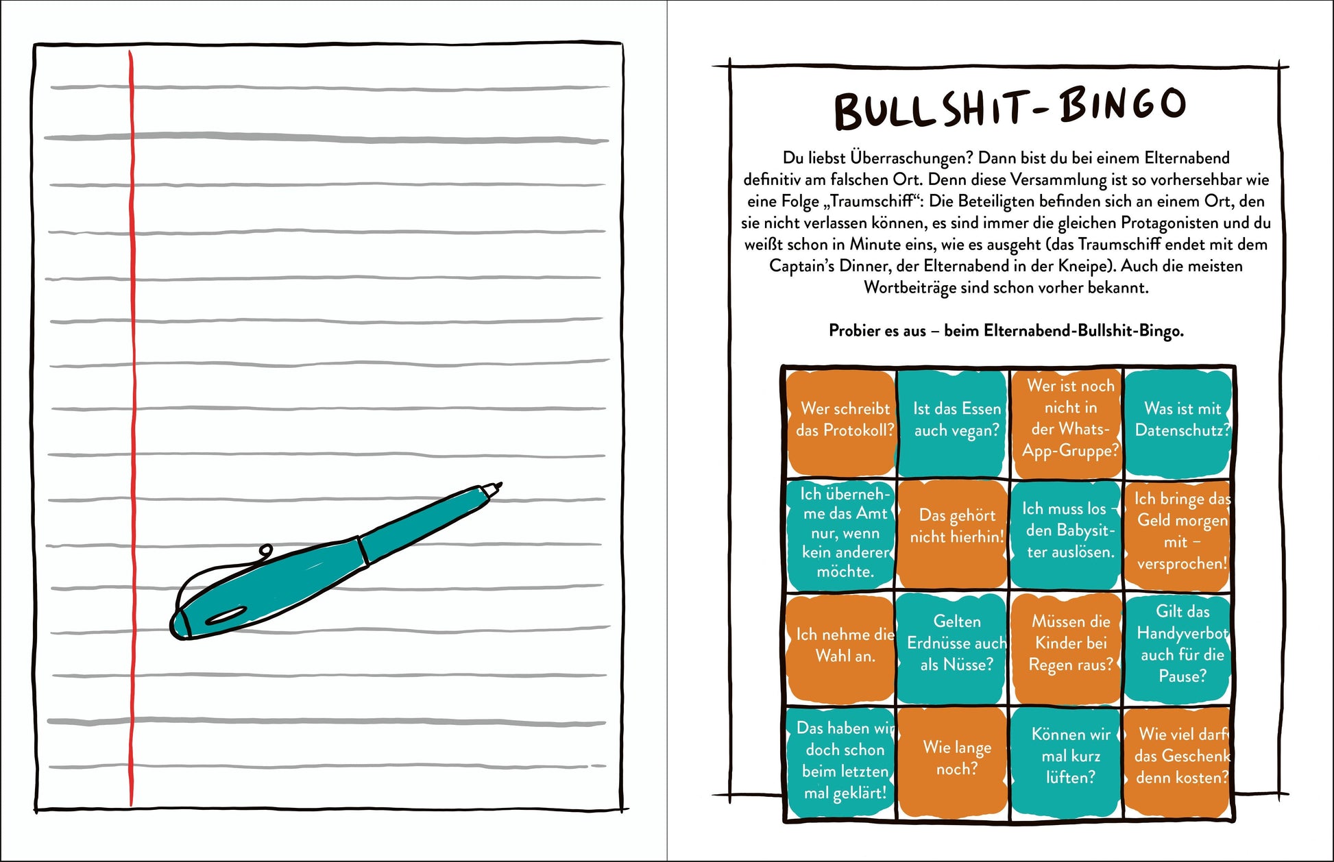 - Lustige Spiele wie Bullshit-Bingo, Doppelnamen-Generator und Schulhaus-Labyrinthe machen jeden Elternabend zu einem kurzweiligen Vergnügen