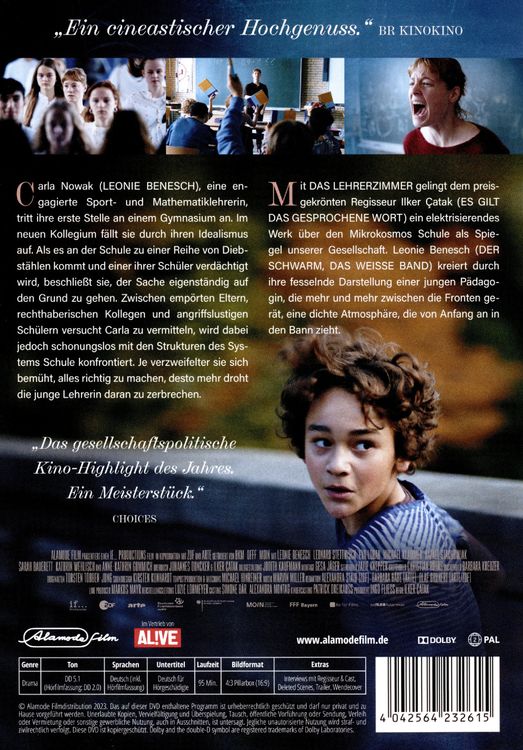 Carla Nowak (LEONIE BENESCH), eine engagierte Sport- und Mathematiklehrerin, tritt ihre erste Stelle an einem Gymnasium an. Im neuen Kollegium fällt sie durch ihren Idealismus auf. Als es an der Schule zu einer Reihe von Diebstählen kommt und einer ihrer Schüler verdächtigt wird, beschließt sie, der Sache eigenständig auf den Grund zu gehen. Zwischen empörten Eltern, rechthaberischen Kollegen und angriffslustigen Schülern versucht Carla zu vermitteln, wird dabei jedoch schonungslos mit den Strukturen des Systems Schule konfrontiert. Je verzweifelter sie sich bemüht, alles richtig zu machen, desto mehr droht die junge Lehrerin daran zu zerbrechen. Mit DAS LEHRERZIMMER gelingt dem preisgekrönten Regisseur Ilker Çatak (ES GILT DAS GESPROCHENE WORT) ein elektrisierendes Werk über den Mikrokosmos Schule als Spiegel unserer Gesellschaft. Leonie Benesch (DER SCHWARM, DAS WEISSE BAND) kreiert durch ihre fesselnde Darstellung einer jungen Pädagogin, die mehr und mehr zwischen die Fronten gerät, eine dichte Atmosphäre, die von Anfang an in den Bann zieht. Anhand ihrer Geschichte hinterfragt der Film auf kritische Weise unsere aktuelle Debattenkultur und entfacht somit eine grundlegende Diskussion rund um Wahrheit und Gerechtigkeit. In den weiteren starken Rollen sind u. a. Eva Löbau und Michael Klammer zu sehen. Kamerafrau Judith Kaufmann (CORSAGE) zeichnete für die eindringliche Bildgestaltung verantwortlich. Presse: - „Mit 'Das Lehrerzimmer' mit der großartigen Leonie Benesch in der Hauptrolle liefert Ilker Çatak seine bislang beste Filmarbeit ab." - (Blickpunkt:Film) - „Auf der diesjährigen Berlinale, wird Leonie Benesch als deutscher Shootingstar geehrt. Wer 'Das Lehrerzimmer' gesehen hat, weiß warum." - (MOZ.de) - „… gut beobachtender und ziemlich intelligenter Film, der es durch seine erzählerische Schlichtheit schafft, das System Schule treffend zu problematisieren." - (Film Rezensionen) - "Ein cineastischer Hochgenuss!" - (BR KINOKINO) - "Das gesellschaftspoltische Kino-Highlight des Jahres! Ein Meisterstück!" - (CHOISES) Auszeichnungen Deutscher Filmpreis: - Bester Spielfilm - Beste Regie - Bestes Drehbuch - Beste weibliche Hauptrolle - Bester Schnitt