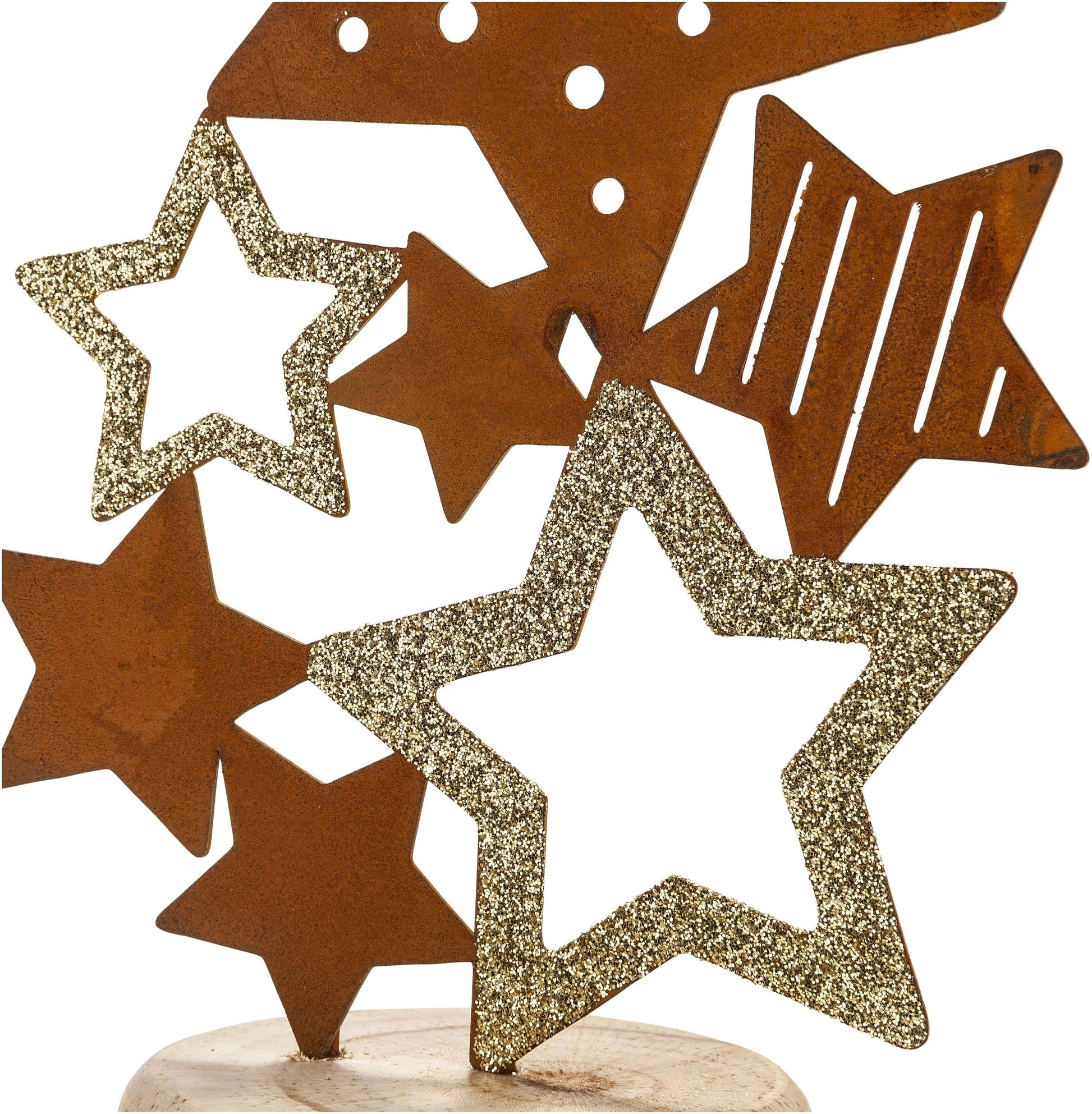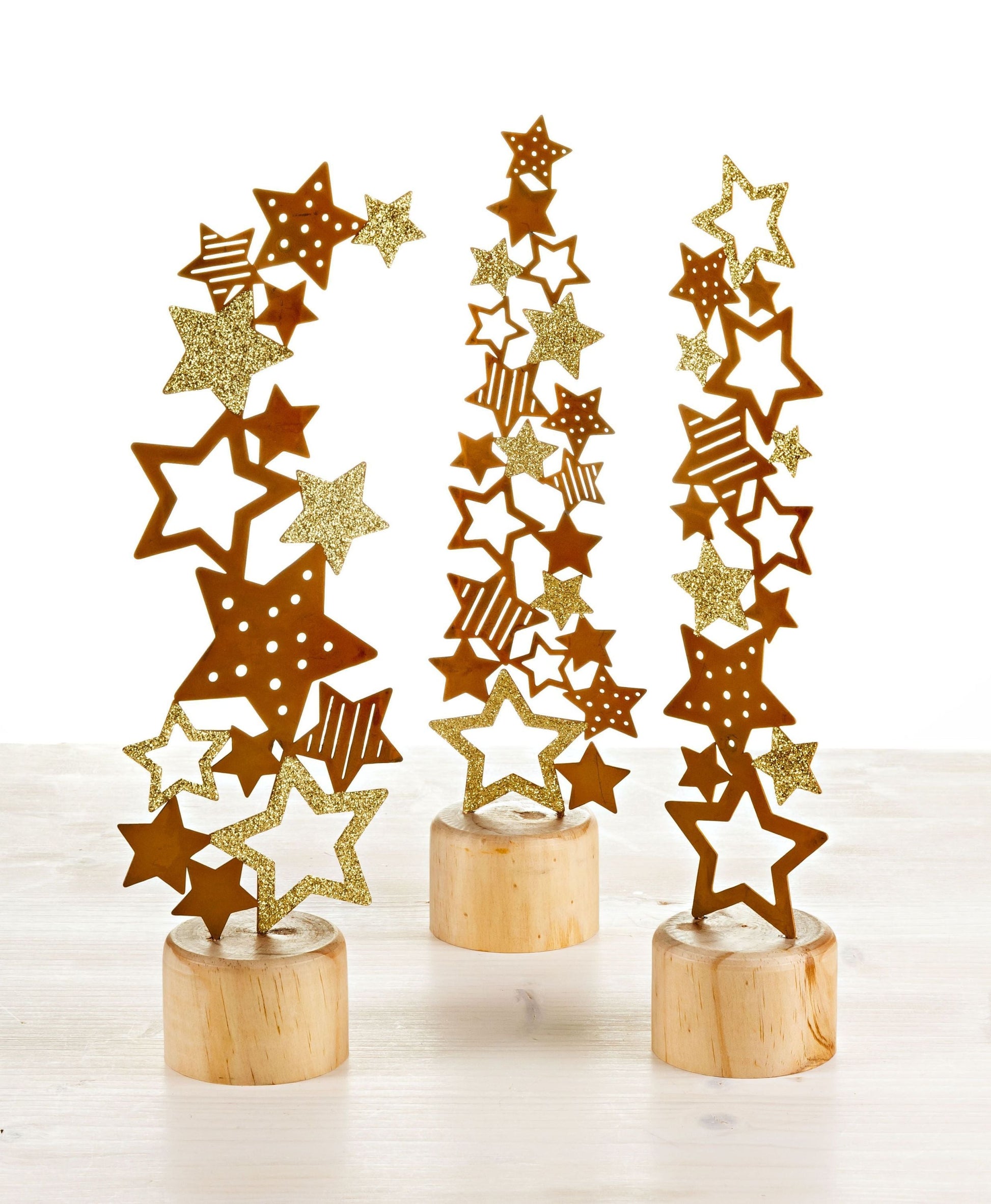 Metallsterne in unterschiedlichen Größen und Designs wurden jeweils zu einem Schwarm zusammengefügt und auf der Vorderseite mit Goldglitter veredelt. Tipp: Wenn Sie eine dezentere Deko bevorzugen, drehen Sie die Aufsteller einfach um.