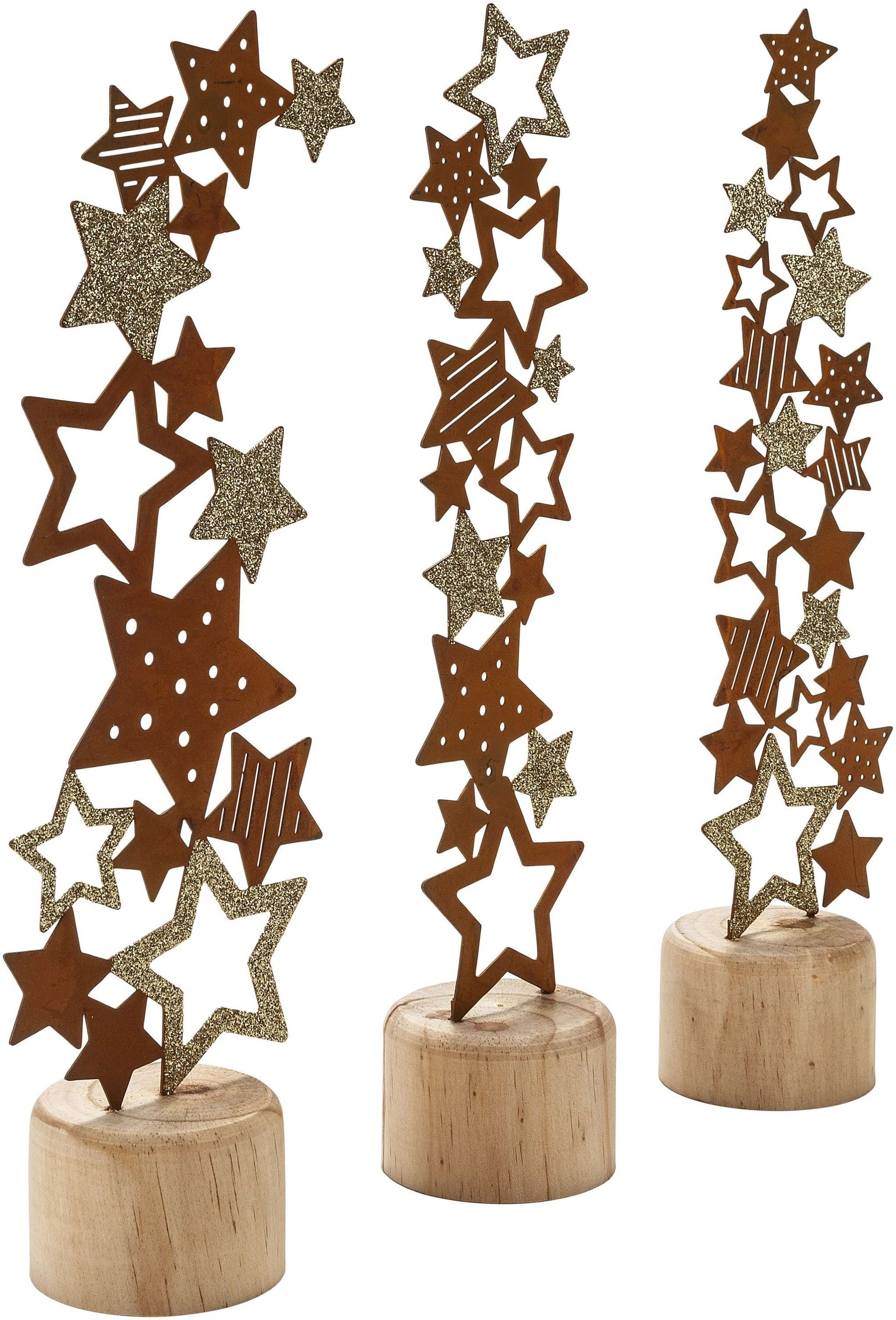 Blickfang hoch drei für Esstisch, Kommode, Fensterbank, Regal, Beistelltisch … Mit diesem Set steht Ihre Winterdeko im Handumdrehen: Der Sternenzauber im trendigen Rostlook ist fix dekoriert, als Trio oder auch einzeln.