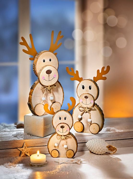 3 weihnachtliche Rentiere aus Baumscheiben mit Rinde 3 Größen: bis 22 cm hoch Liebevoll handbemalt & weihnachtlich geschmückt Zum Hinstellen Jedes Stück ein Unikat Deko Rentiere "Familie Woldemar" 3er-Set für eine tierisch vergnügliche Winterzeit Ho, ho, ho ... mit diesen niedlichen Rentieren hält weihnachtliche Stimmung bei Ihnen Einzug. Die Rentierfamilie Woldemar besteht aus Papa, Mama und Rentierkind und auch wenn die drei gerne zusammenstehen, lassen sie sich wunderbar auch einzeln dekorieren. Jedes der Familienmitglieder ist aus fünf Baumstammscheiben sorgfältig zusammengefügt und auf der Vorderseite liebevoll bemalt. Die Baumstammrinde ist noch original erhalten, was der Deko ein natürliches und rustikales Flair verleiht. Jedes Stück ein Unikat Jedes der drei Deko Rentiere ist mit Liebe zum Detail bemalt und einzigartig. Das Geweih ist aus rostfarbenem Metall gefertigt und auf der Rückseite fest verschraubt. Dass die Woldemars sich schon richtig auf Weihnachten freuen, zeigt ihre stimmungsvolle Deko: Jedes der Rentiere trägt um den Hals ein Juteband mit zwei kleinen weißen Holzkugeln und einem goldfarbenen Glitzerstern aus Holz. Dadurch dass die unterste Baumscheibe angesägt ist, sind die Rentierfiguren absolut standsicher. Ob auf dem Fensterbrett oder dem Regal, ob im Hauseingang oder auf dem Sideboard, die Familie Woldemar fühlt sich überall wohl. Deko Rentiere Familie Woldemar 3er-Set: - 3 Baumstammfiguren im Rentierdesign - Jede Figur aus 5 Baumscheiben mit Rinde - Sorgfältig handbemalt (einseitig) - Geweih aus rostfarbenem Metall - Jedes Rentier weihnachtlich geschmückt mit Juteband, 2 weißen Holzperlen und einem goldfarbenen Glitzerstern aus Holz - 3 Größen: 22 cm, 18, cm, 14 cm (Höhe) Lassen Sie sich von einer drolligen Rentierfamilie durch den Winter begleiten und bestellen Sie gleich hier online Deko Rentiere Familie Woldemar 3er-Set.
