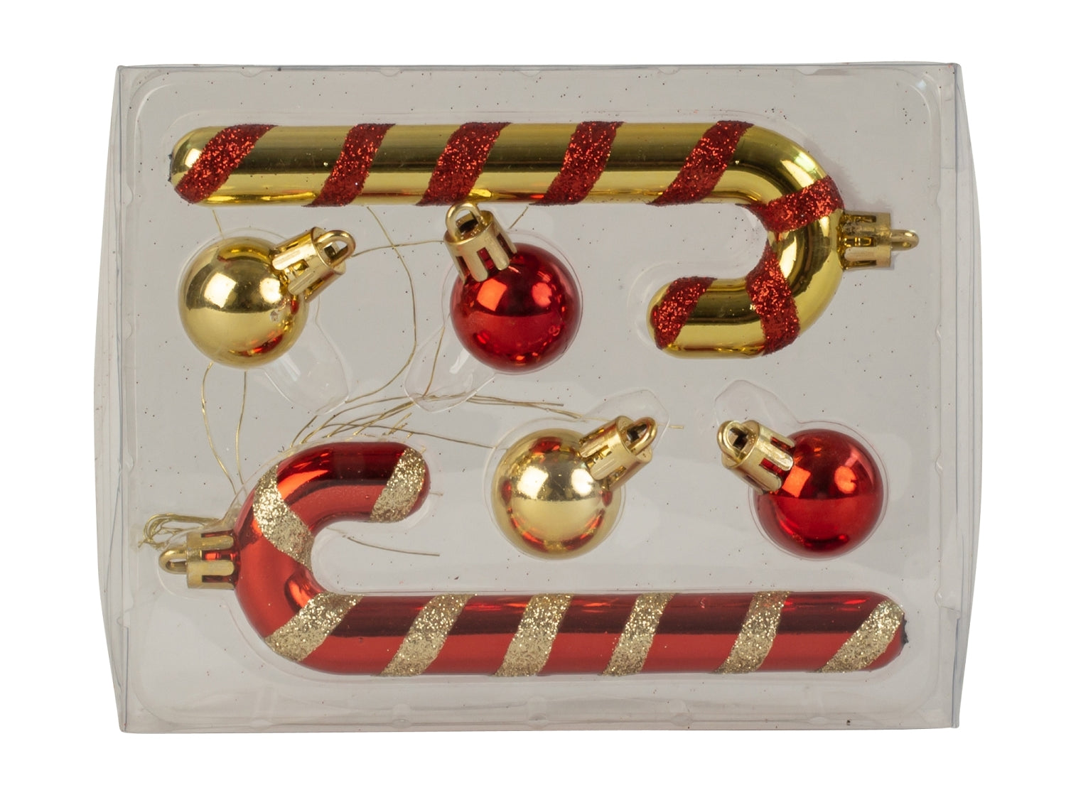 Das originelle Weihnachtsanhänger-Set aus Kunststoff besteht aus 2 Zuckerstangen und 4 Kugeln in Rot und Gold.