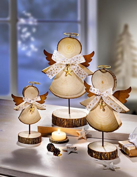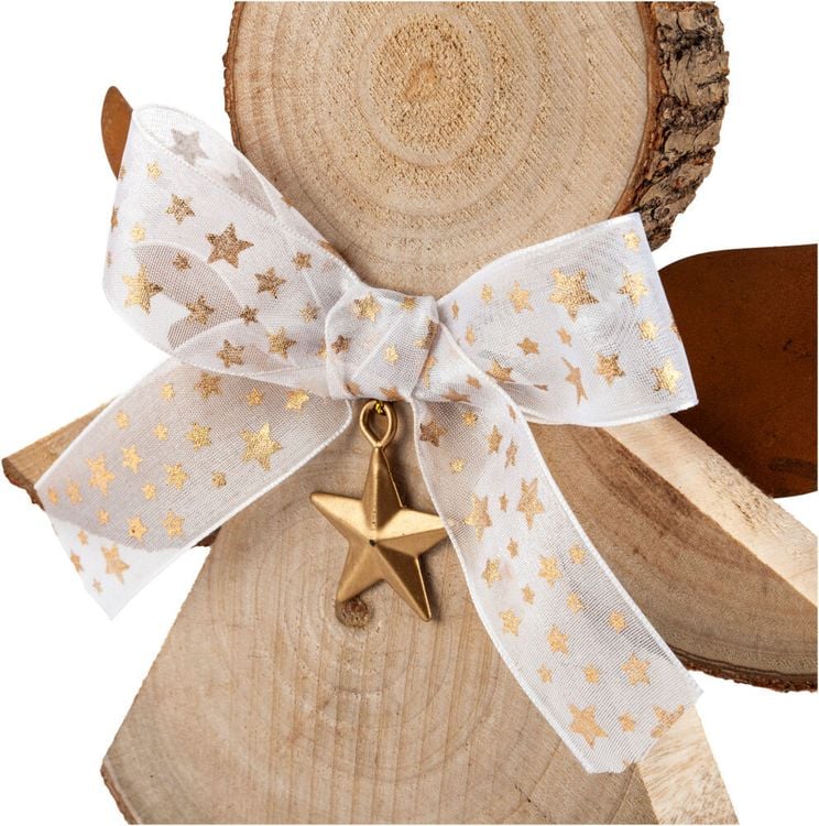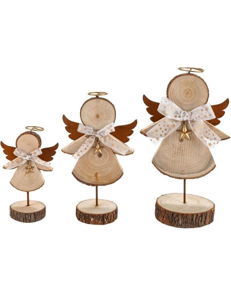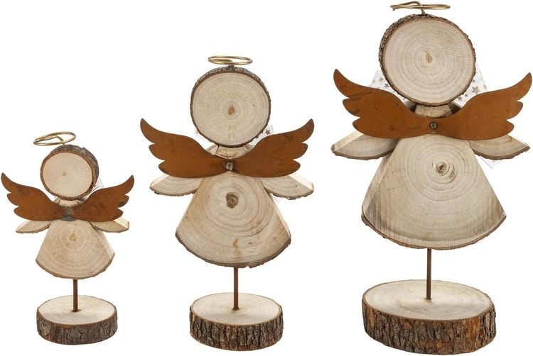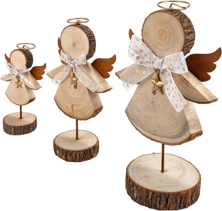 Schutzengel-Trio aus echtem Holz Höhe max. 25,5 cm Hübsch dekoriert Jedes Stück ein Unikat Himmlische Begleiter: Dekofigur Holzengel, 3er-Set Eine ganz besondere Deko für Wohn- und Schlafzimmer ... und auch eine bezaubernde Geschenk-Idee! 3 Engel in stilisierter Form setzen Akzente: Körper und Kopf bestehen aus echtem Holz. Die individuelle Maserung macht jeden Engel zu einem unverwechselbaren Einzelstück. Die Rinde gibt den Holzfiguren eine Kontur und rundet das Design kunstvoll ab. Flügel und Heiligenschein sind jeweils aus Metall gefertigt; das setzt einen aparten Kontrast zum naturbelassenen Holz. Zusätzlich sind die Engelchen mit einer Schleife aus Organza dekoriert; auf ihr glänzen goldfarbene Sterne, passend zum Farbton des Heiligenscheins. Ein goldfarbener Stern als Anhänger setzt dann noch das i-Tüpfelchen auf ein ganz besonderes Holz-Kunststück! Dekofigur Holzengel, 3er-Set aus echtem Holz mit Rinde individuell geformt und gemasert: jedes Stück ein Unikat Flügel aus Metall in einem Rost-Farbton Heiligenschein aus Metall in schimmerndem Goldton Organzaband mit goldfarbenen Sternchen (100% Polyester) Stern-Anhänger aus Holz, goldfarben Maße: Höhe 25,5/ 20/ 15 cm; Breite 15/ 12,5/ 8,5 cm Zum Verschenken oder Behalten: Die Dekofiguren Holzengel, 3er-Set, sind als Trio ein wunderschönes Präsent für liebe Menschen. Aber auch einzeln sind sie ein bezaubernde Mitbringsel zum Kaffeeklatsch oder als kleines Dankeschön. Jetzt gleich in den Warenkorb legen und noch heute bei uns online kaufen!